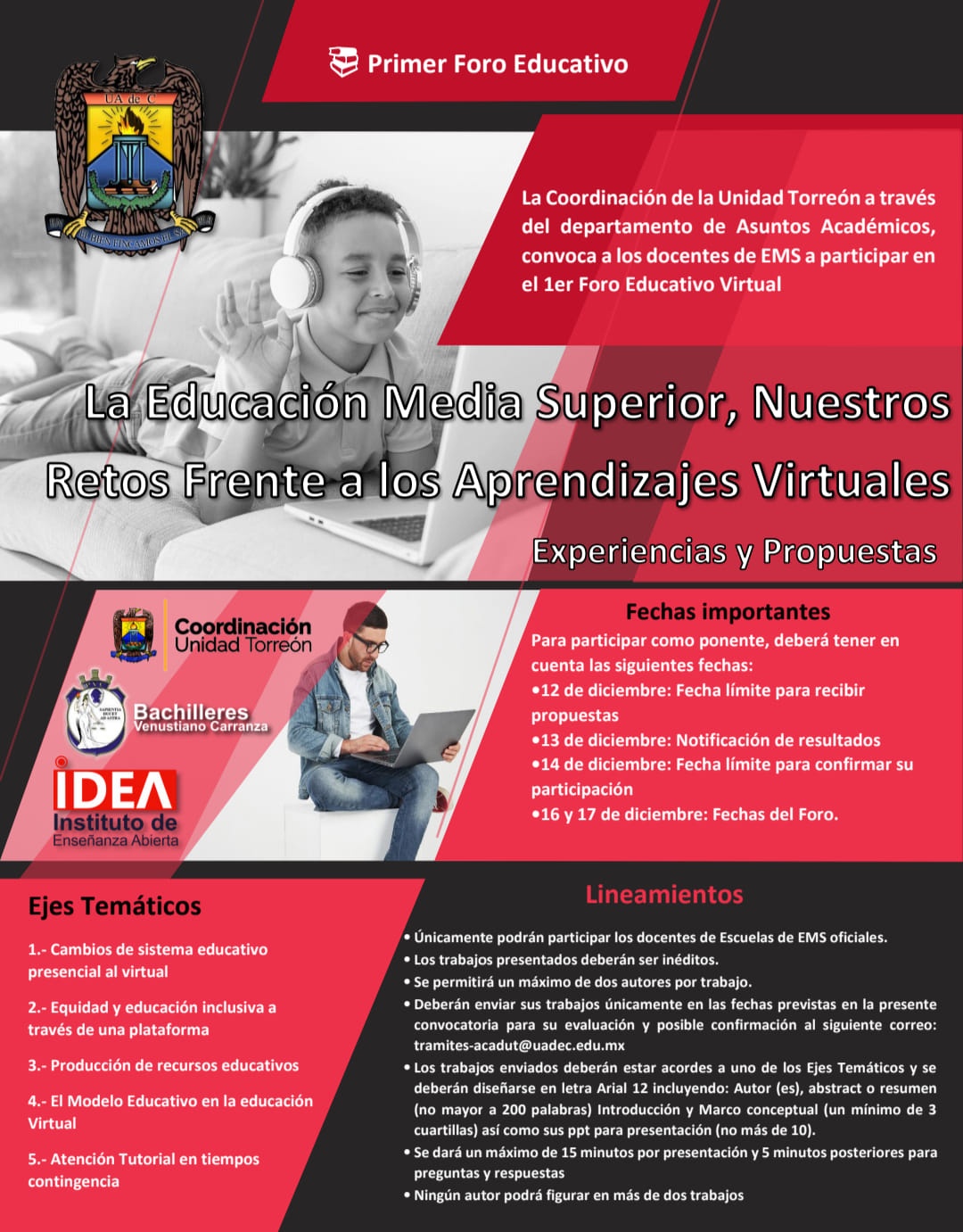 Torreón.- La Universidad Autónoma de Coahuila a través de la Coordinación de Unidad Torreón y el Departamento de Asuntos Académicos convoca a docentes de Educación Media Superior a participar en el Primer Foro Educativo Virtual “La Educación Media Superior, Nuestros Retos Frente a los Aprendizajes Virtuales” que se llevará a cabo el 16 y 17 de diciembre de 2020.