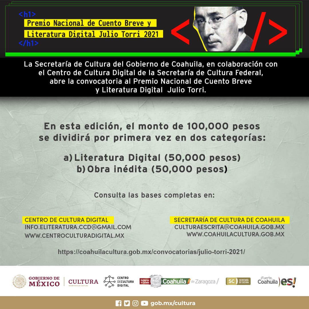 La Secretaría de Cultura de Coahuila (SC), en coordinación con el Centro de Cultura Digital de la Secretaría de Cultura Federal, convocan a participar en el Premio Nacional de Cuento Breve y Literatura Digital Julio Torri.