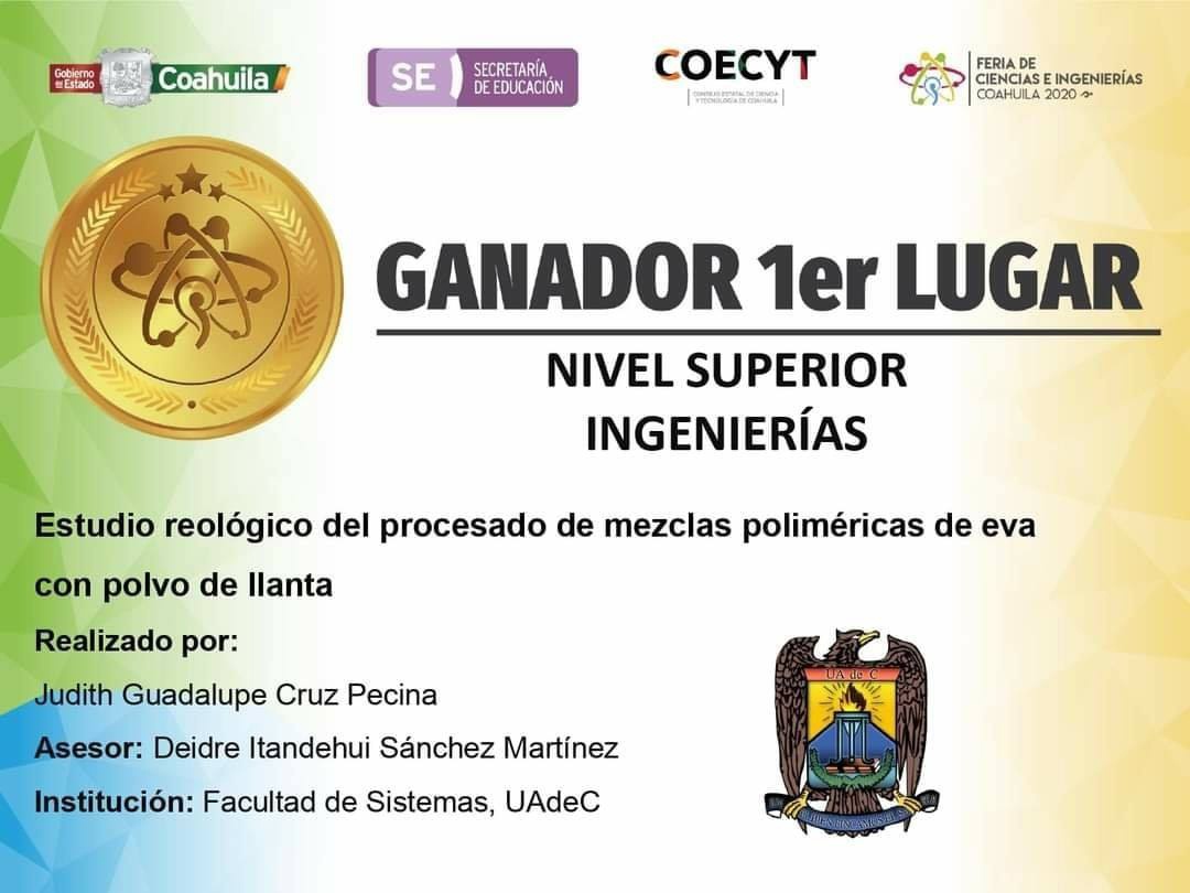 Gracias al proyecto de investigación científica “Estudio reológico del procesado de mezclas poliméricas de EVA con polvo de llanta”, la Facultad de Sistemas de la Universidad Autónoma de Coahuila obtuvo el primer lugar de la “Feria de Ciencias e Ingenierías Coahuila 2020”, organizada por el Consejo Estatal de Ciencia y Tecnología (COECYT).