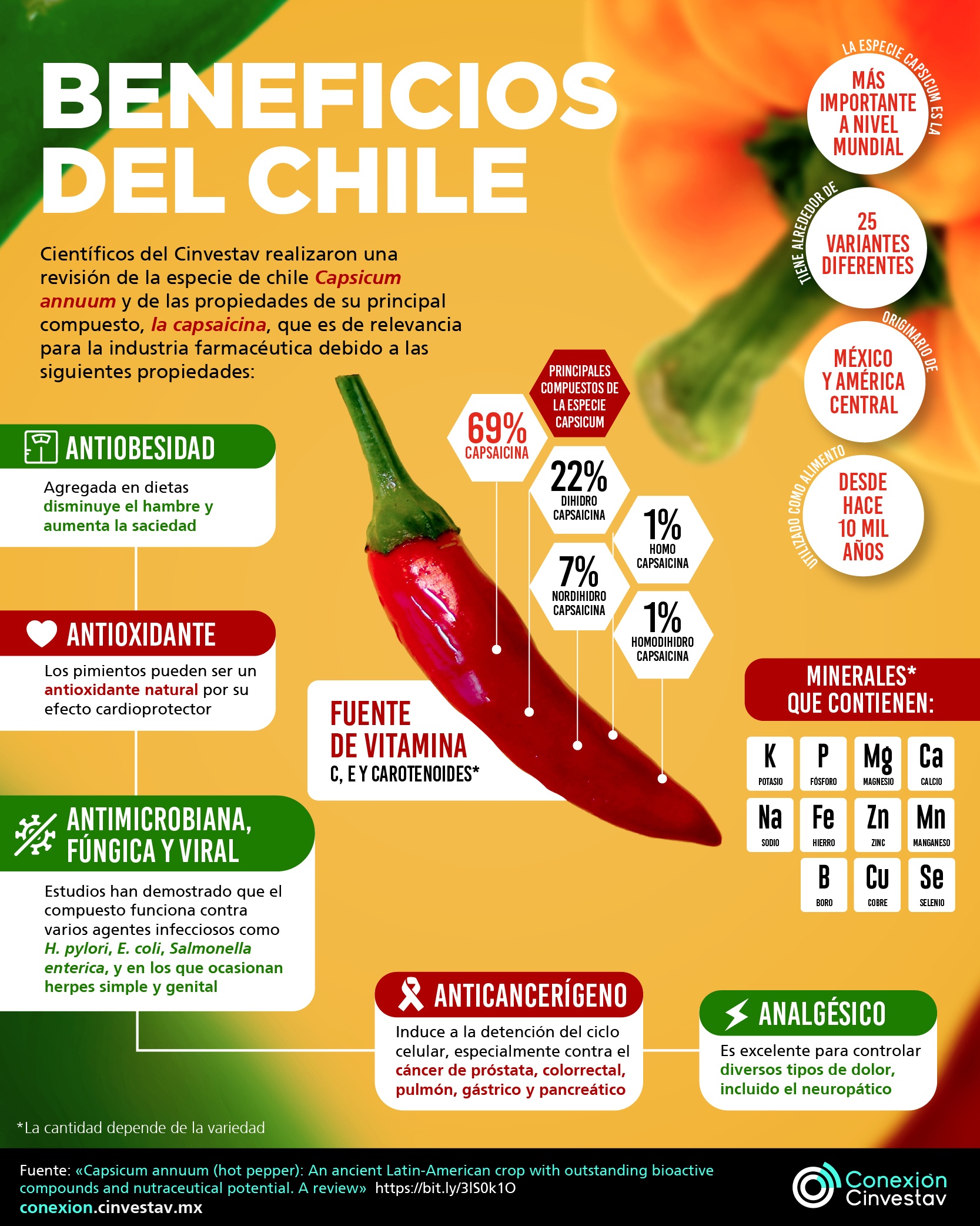 De hecho, el documento publicado por el grupo de investigación del Cinvestav Unidad Irapuato hace referencia a los resultados de distintas líneas de investigación a nivel mundial que en la última década ponen de manifiesto los usos terapéuticos y propiedades médicas de la capsaicina, uno de los principales capsaicinoides que contiene el chile.