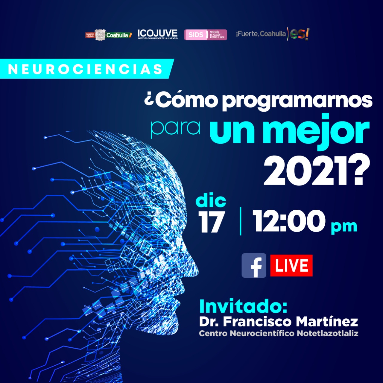 La Secretaría de Inclusión y Desarrollo Social del Estado (SIDS), a través del Instituto Coahuilense de la Juventud (ICOJUVE), realizará la transmisión en vivo “Programación con Neurociencia para un mejor 2021”, donde Francisco Martínez, especialista del Centro Neurocientífico Notetlazotlaliz, explicará que la neurociencia nos ayuda al entendimiento científico de cómo trabaja nuestro cerebro, y a conocer de qué depende científicamente nuestro estado emocional.
