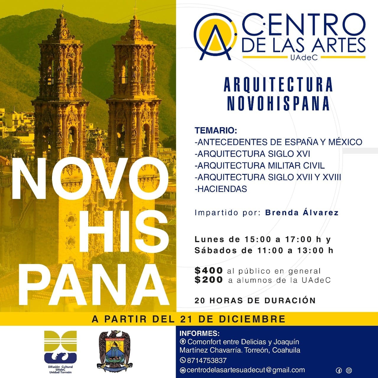 Torreón.- El Centro de Artes Unidad Torreón de la Universidad Autónoma de Coahuila, invita al curso “Arquitectura Novohispana” que iniciará el 21 de diciembre de 2020 y el cual está dirigido a quienes estén interesados en profesionalizarse en las artes, a través de diferentes medios digitales.
