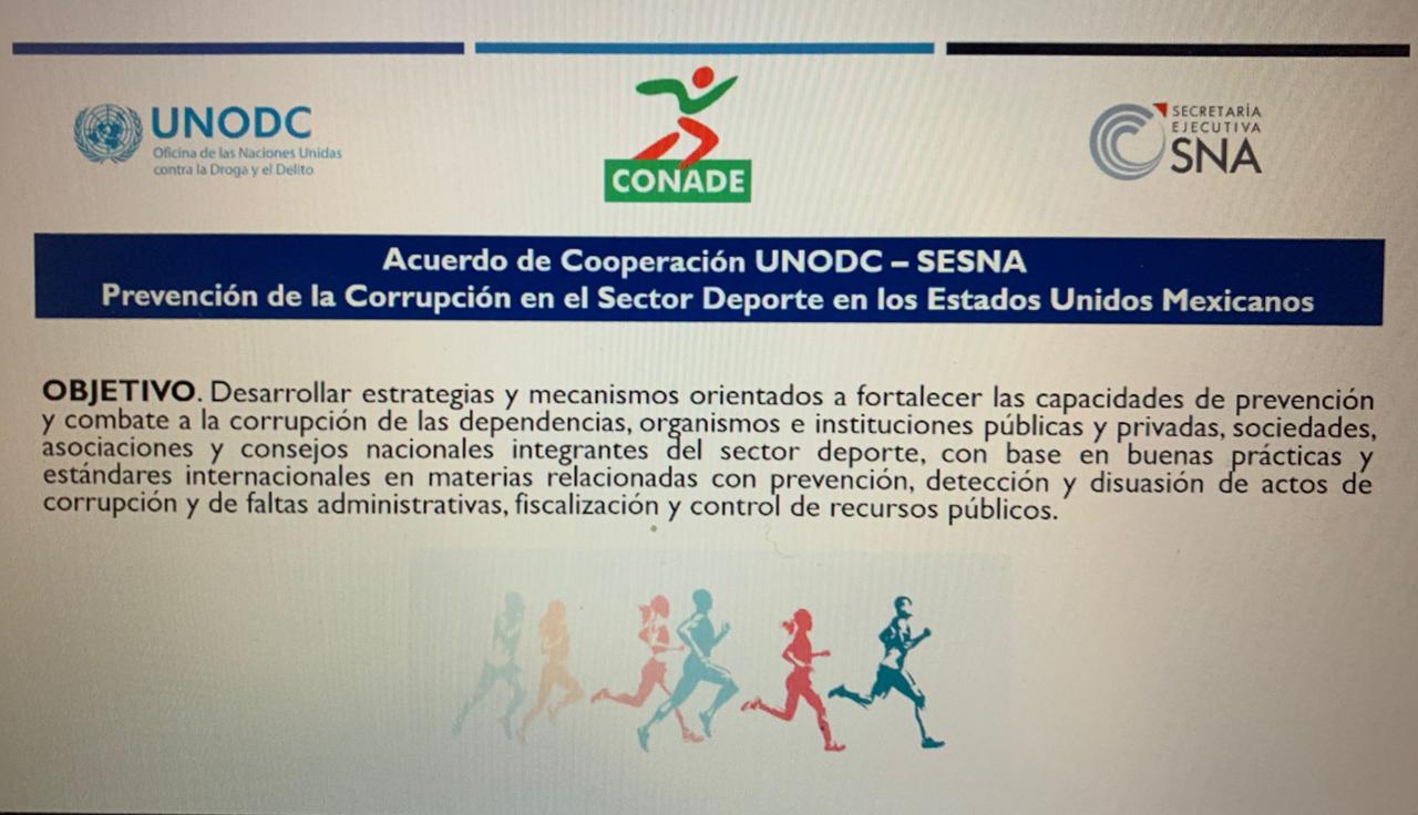 Este acuerdo de cooperación tiene como objetivo desarrollar estrategias y mecanismos orientados a fortalecer las capacidades de prevención y combate a la corrupción de las dependencias, organismos e instituciones públicas y privadas, sociedades, asociaciones y consejos nacionales integrantes del sector deporte, con base en buenas prácticas y estándares internacionales en materias relacionadas con prevención, detección y disuasión de actos de corrupción y de faltas administrativas, fiscalización y control de recursos públicos.
