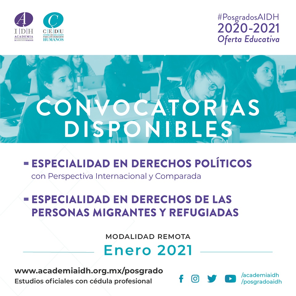 La Academia Interamericana de Derechos Humanos AIDH de la Universidad Autónoma de Coahuila, extiende al 31 de diciembre de 2020 la fecha para postularse a la especialidad en Derechos Políticos con Perspectiva Internacional y Comparada y la Especialidad en Derechos de las Personas Migrantes y Refugiadas para el semestre enero-junio de 2021.