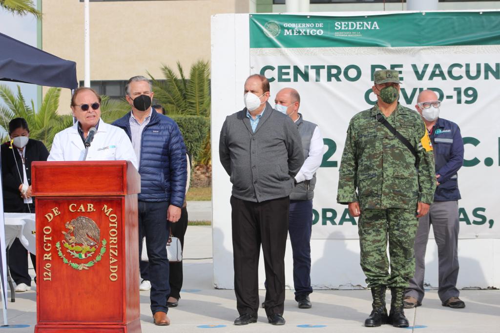 “Nuestra primera meta es vacunar a 17 mil 500 profesionales de la salud en el estado, agradecemos las facilidades de las autoridades del 12º Regimiento de Caballería Motorizado de aquí de Piedras Negras, para realizar esta labor”.