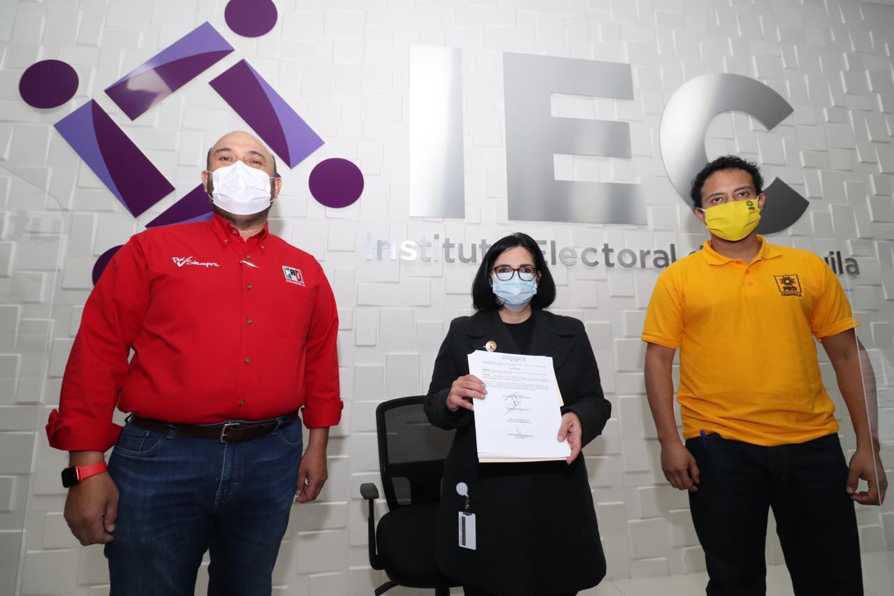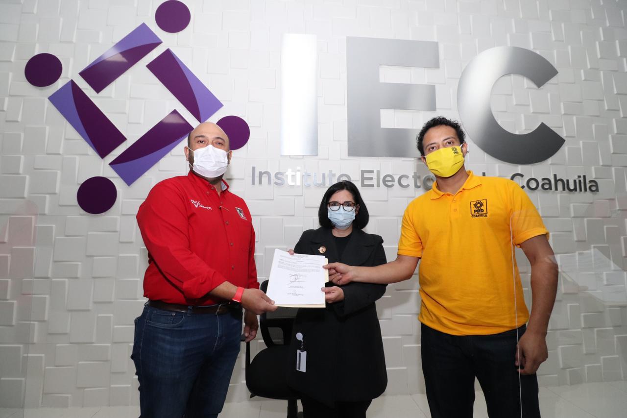 Los líderes del PRI y PRD en Coahuila, Rodrigo Fuentes Ávila y Ángel Sánchez Guajardo, respectivamente, acudieron al Instituto Electoral de Coahuila, (IEC), a presentar la solicitud de registro del convenio de coalición ante la Consejera Presidenta, Gabriela de León Farías.