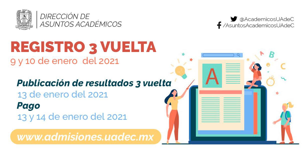 Para la tercera vuelta no se compra ficha ni se presenta examen, el aspirante sólo debe ingresar a la página www.admisiones.uadec.mx y dar “clic” en el enlace que dice “registro”, se debe tener a la mano el número de ficha y de registro; al momento de ingresar, se indican los lugares disponibles de los bachilleratos y carreras a las que se aspira a ingresar.