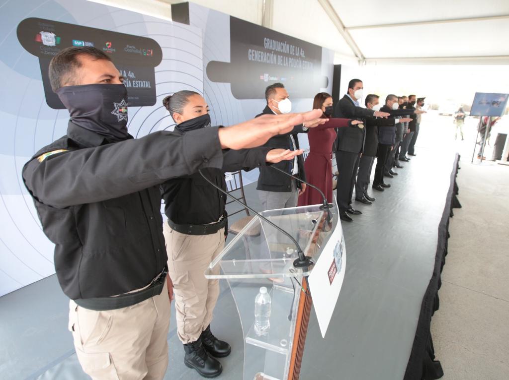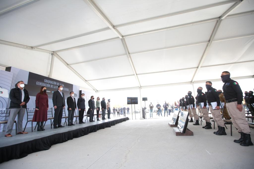 El Mandatario estatal destacó la vocación y compromiso de los nuevos elementos para salvaguardar el patrimonio y la integridad de los coahuilenses, ya que para el Estado la seguridad es una prioridad, por lo que la meta es tener más elementos y ser la Policía mejor pagada de país.
