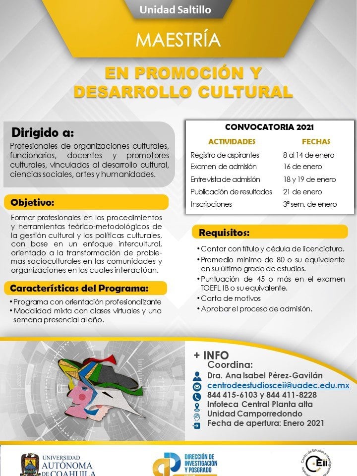 El Centro de Estudios e Investigaciones Interdisciplinarias de la Universidad Autónoma de Coahuila convoca a profesionales de organizaciones culturales, funcionarios, docentes, y promotores culturales, vinculados al desarrollo cultural, ciencias sociales, artes y humanidades a cursar la maestría en Promoción y Desarrollo Cultural.