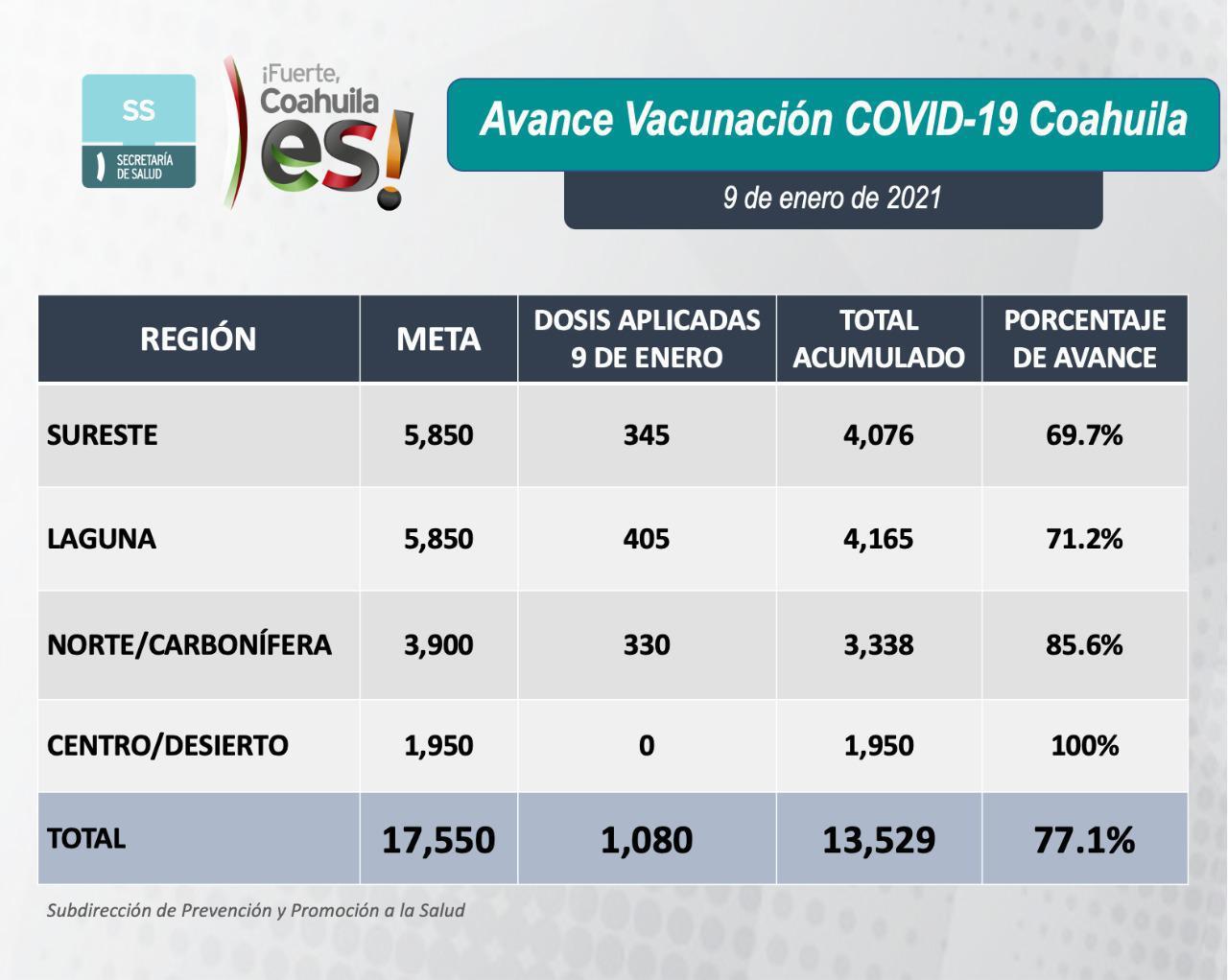 En las regiones Norte y Carbonífera se tiene ya el 85.6 por ciento, con la aplicación de 3 mil 338 dosis de 3 mil 900 proyectadas.