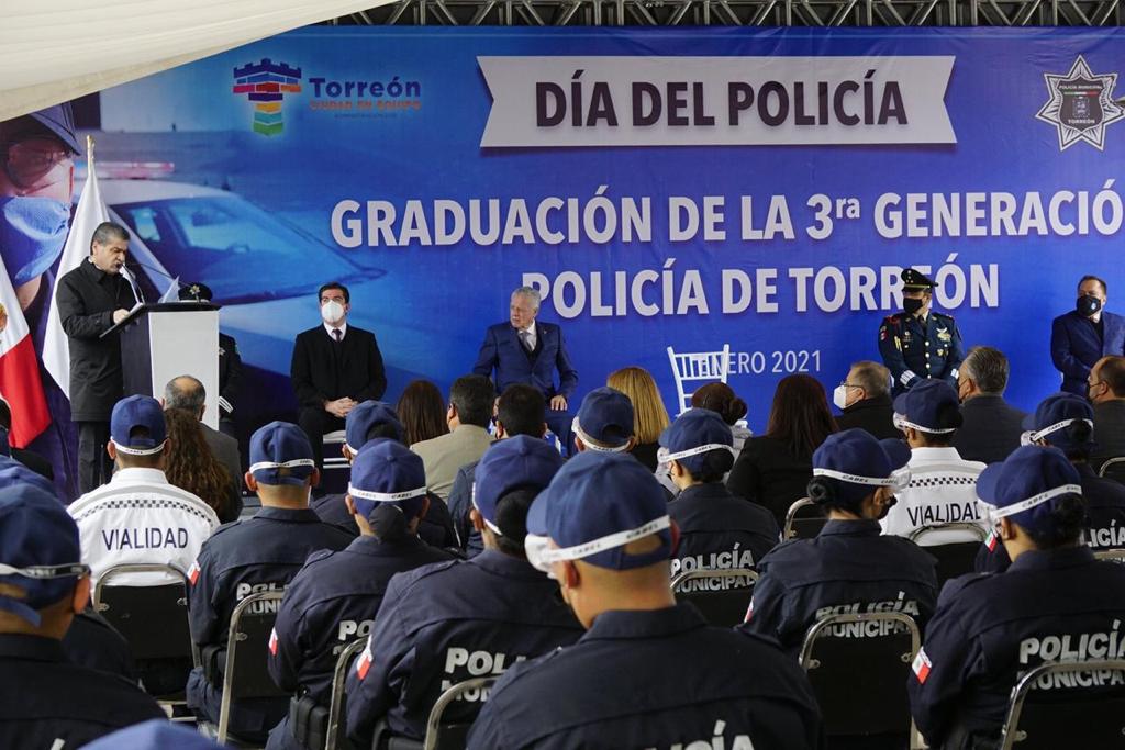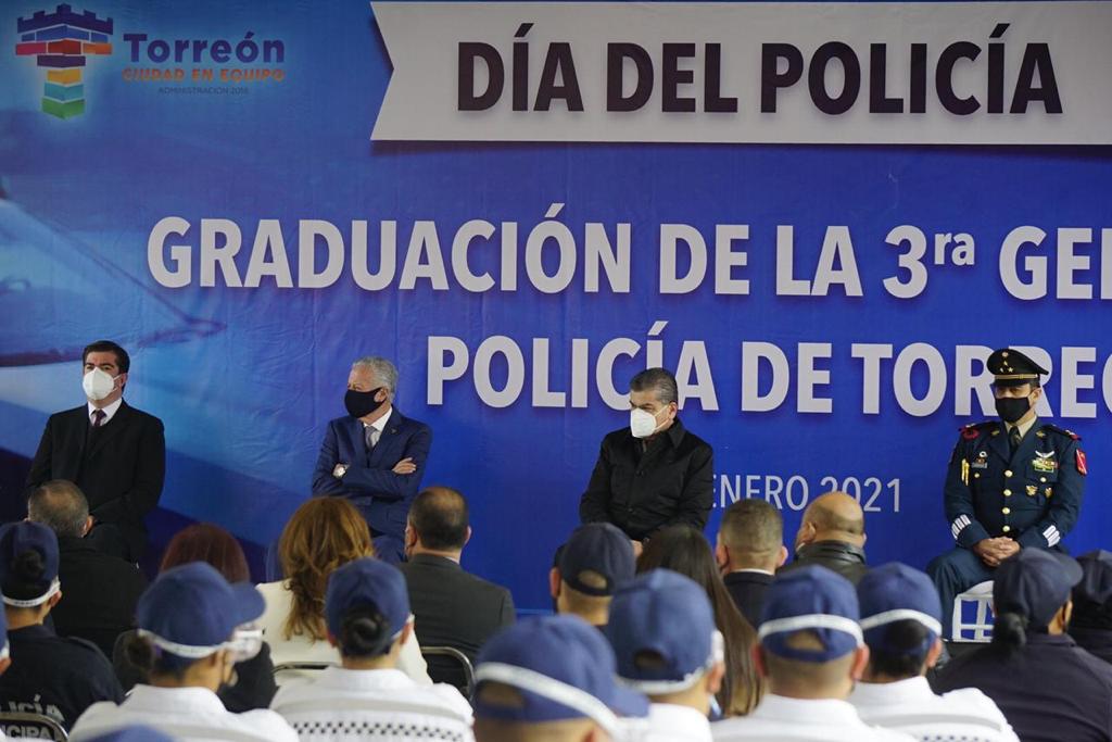 Lo anterior, al asistir a la graduación de la Tercera Generación de Policías de Torreón, ceremonia en la que se graduaron 108 elementos: 36 mujeres y 72 hombres.