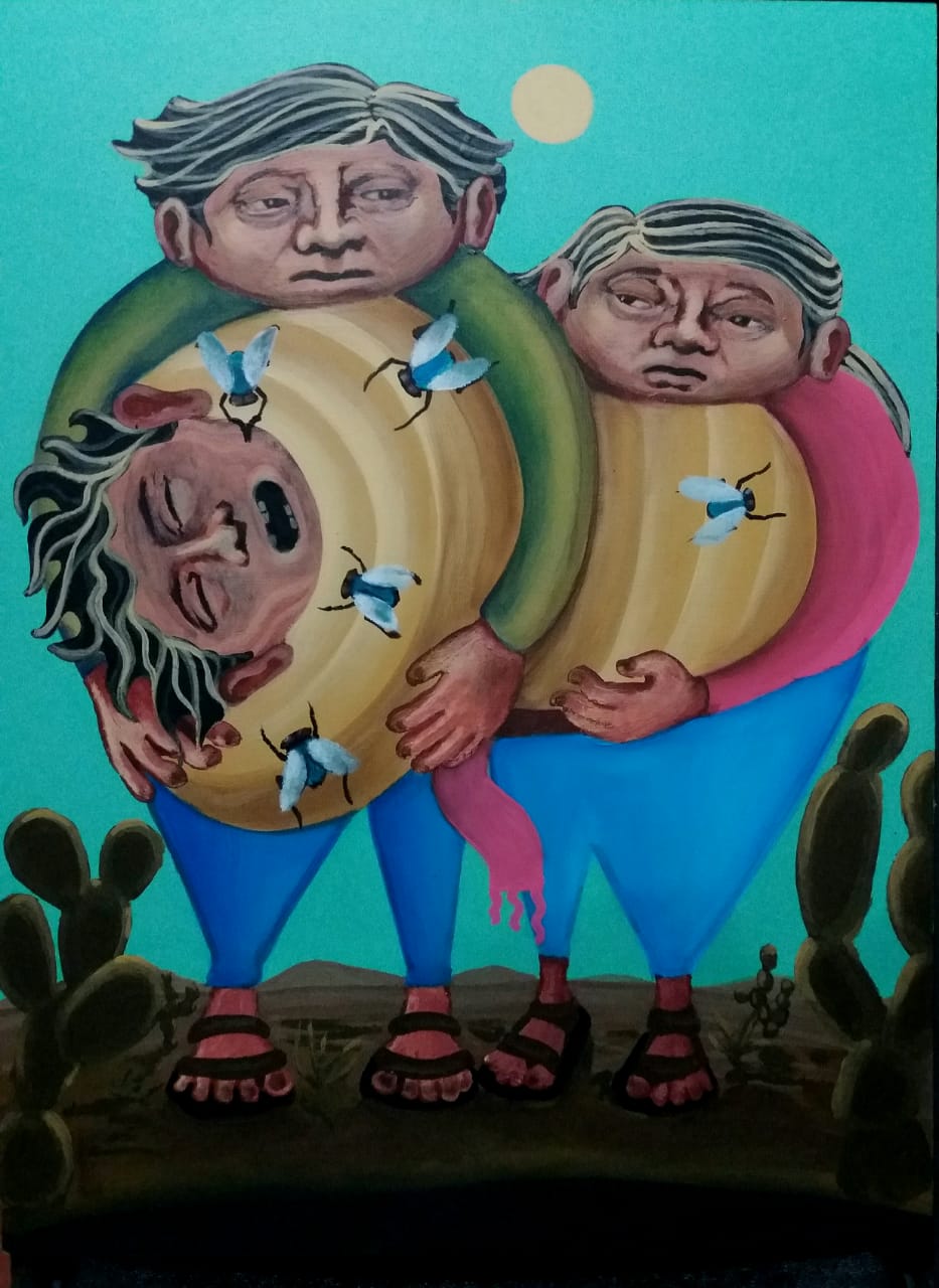 Asimismo, explicó que dicha exhibición está compuesta por alrededor de 14 cuadros de diferentes formatos y está inspirada en el libro de cuentos «El Llano en Llamas» del escritor mexicano Juan Rulfo, en el cual se plasma una visión de desesperanza e injusticias, desde sus personajes.