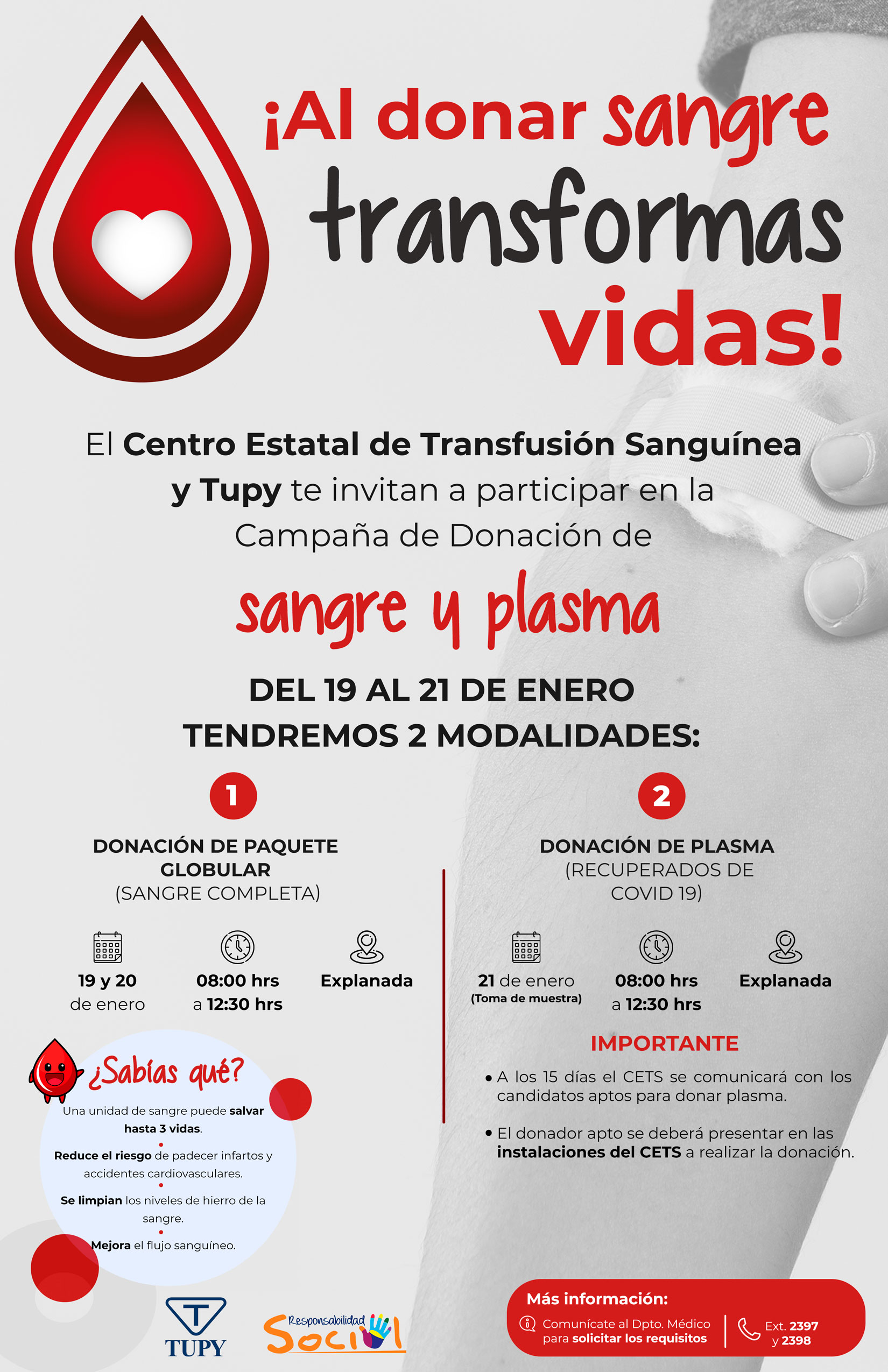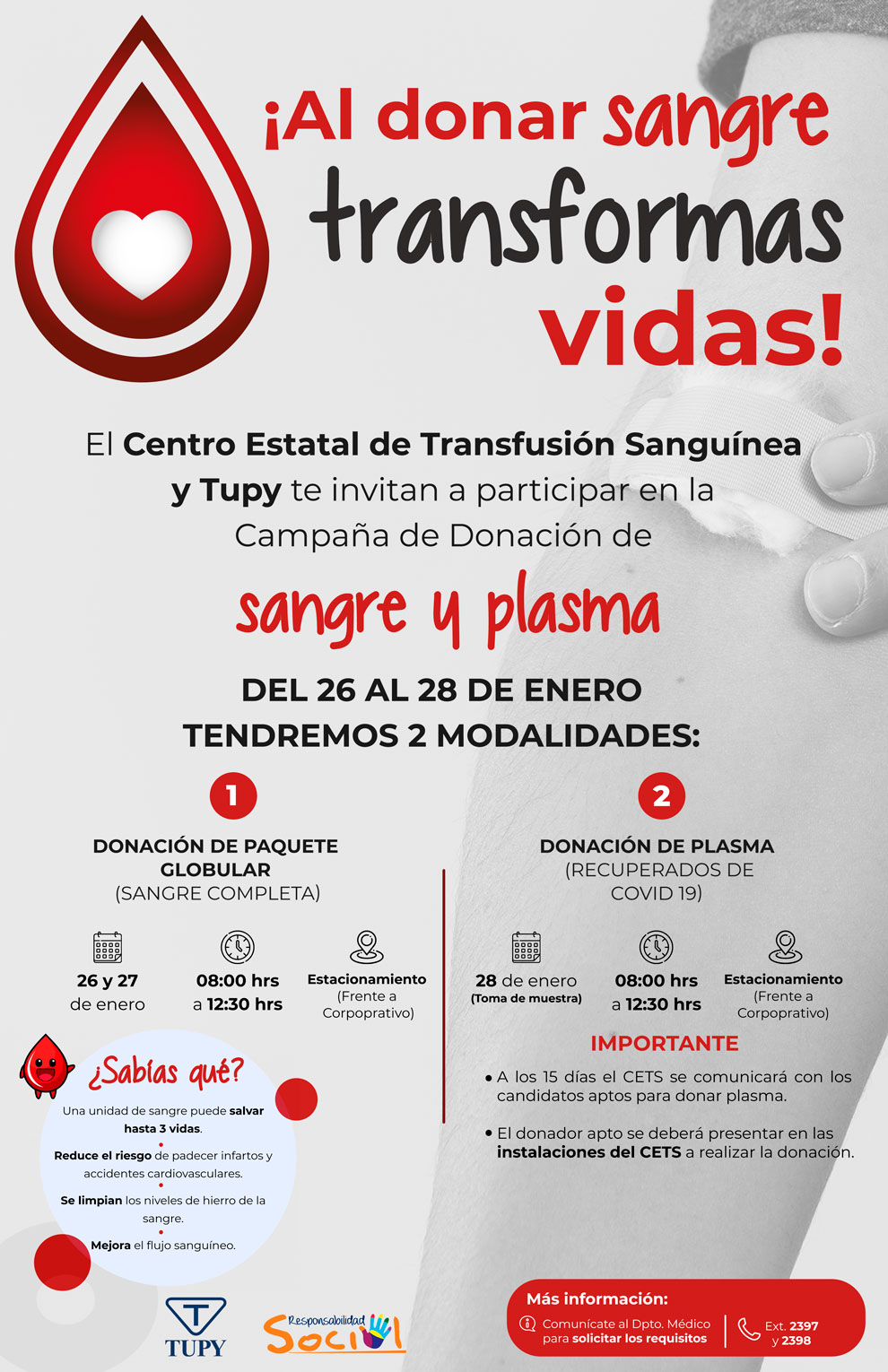 “En Tupy somos conscientes de la importancia de promover estas iniciativas bajo el contexto actual que vive México; donar sangre y donar plasma, es donar vida. Estas acciones representan no solo una solución a una necesidad inminente, sino una esperanza de salud para muchos pacientes que hoy requieren de ese apoyo fundamental”, comentó Agustín Terrazas, Director de Recursos Humanos de la empresa.