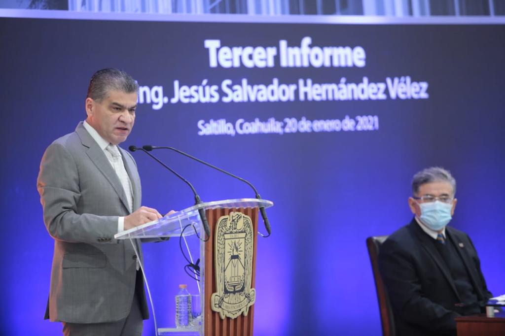 Subrayó que Coahuila es el Estado que más pruebas Covid-19 aplica; de las entidades que más empleos ha recuperado y de los más seguros del País, al asistir como testigo de honor en el III Informe de Actividades del Rector de la Universidad Autónoma de Coahuila (UAdeC), Jesús Salvador Hernández Vélez, en la Villa de Arteaga.