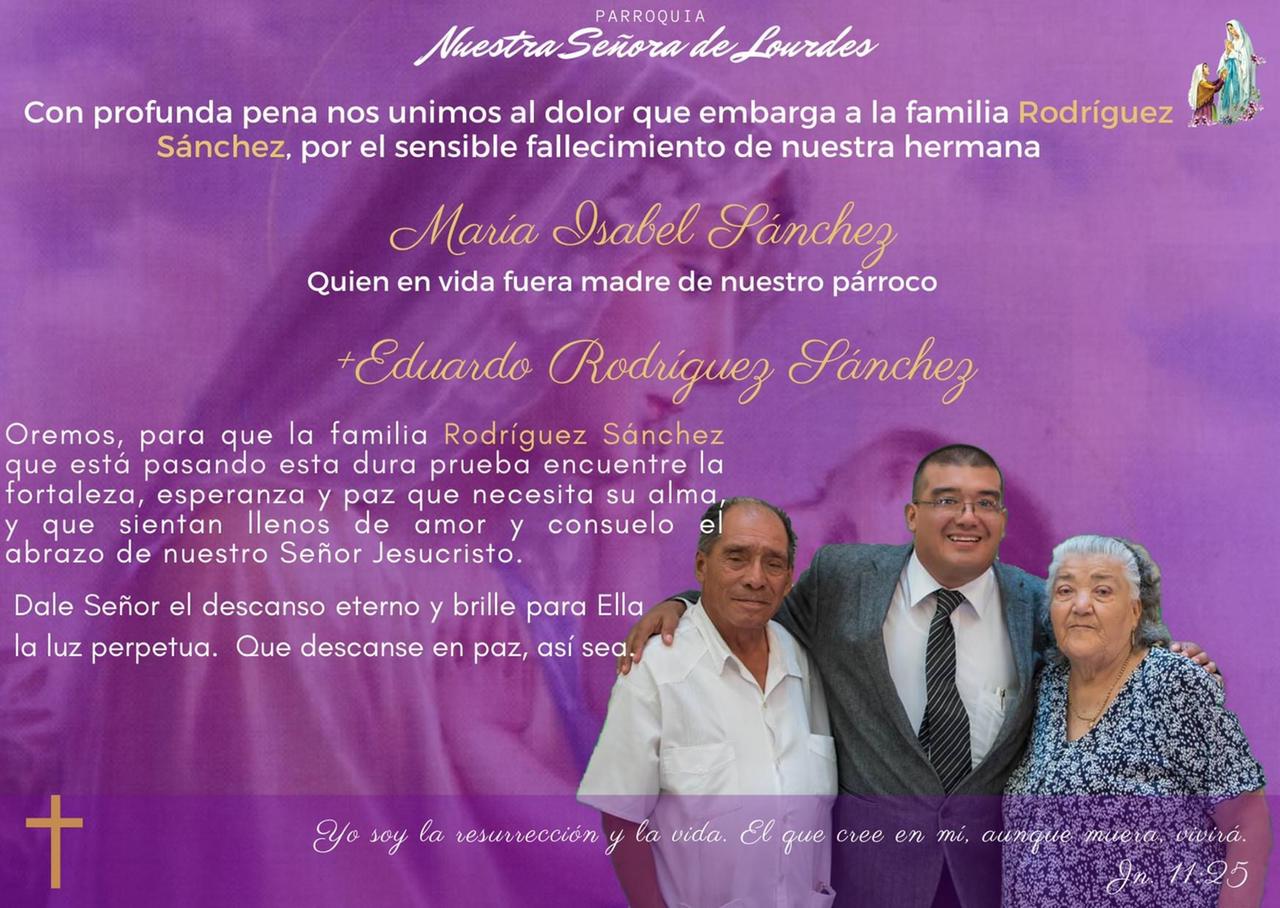 Luego del fallecimiento −la tarde de este martes− del sacerdote Eduardo Rodríguez Sánchez −responsable de la Parroquia de Nuestra Señora de Lourdes− por Covid-19, la organización de este espacio religioso informó que su madre, María Isabel Sánchez, perdió la vida a causa de esta enfermedad infecciosa, este miércoles.