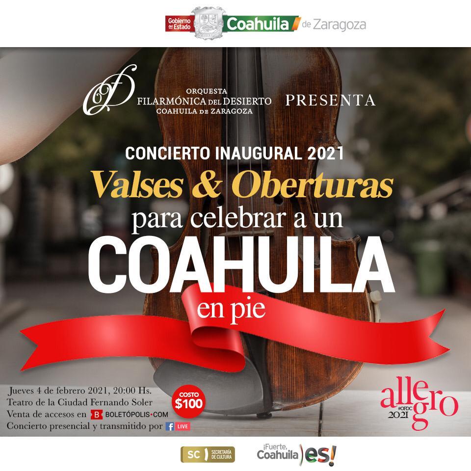 El próximo 4 de febrero, a partir de las 8:00 de la noche, la Orquesta Filarmónica del Desierto de Coahuila (OFDC) ofrecerá el concierto inaugural de su Temporada 2021 «Valses y Oberturas para Celebrar a un Coahuila en Pie», el cual se realizará en el Teatro de la Ciudad Fernando Soler.