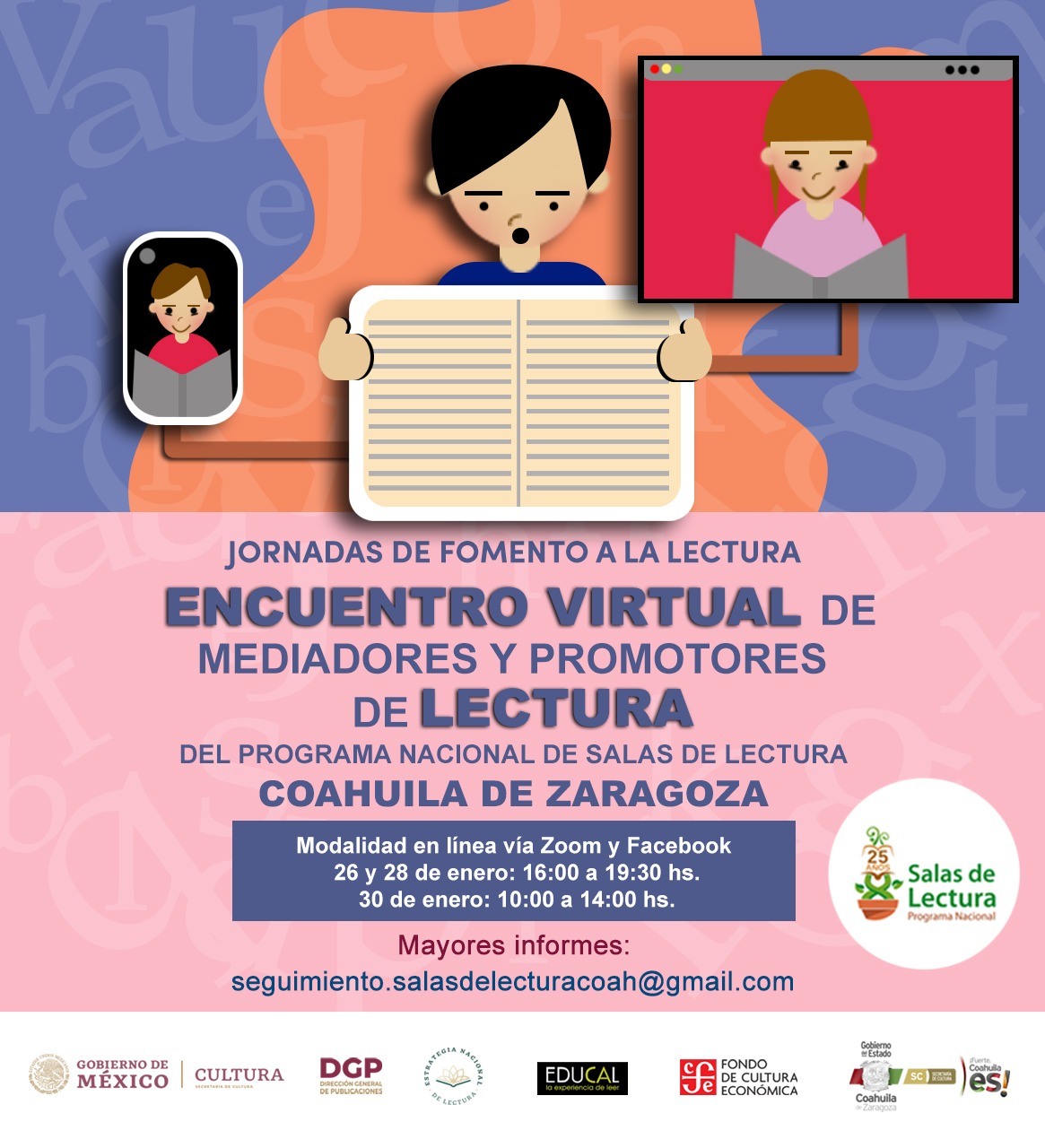 La Secretaría de Cultura de Coahuila (SC) y la Dirección General de Publicaciones de la Secretaría de Cultura del Gobierno Federal, a través del Programa Nacional de Salas de Lectura (PNSL) y en coordinación con el Fondo de Cultura Económica, invitan a participar en el Encuentro Estatal de Mediadores de Lectura de Coahuila.