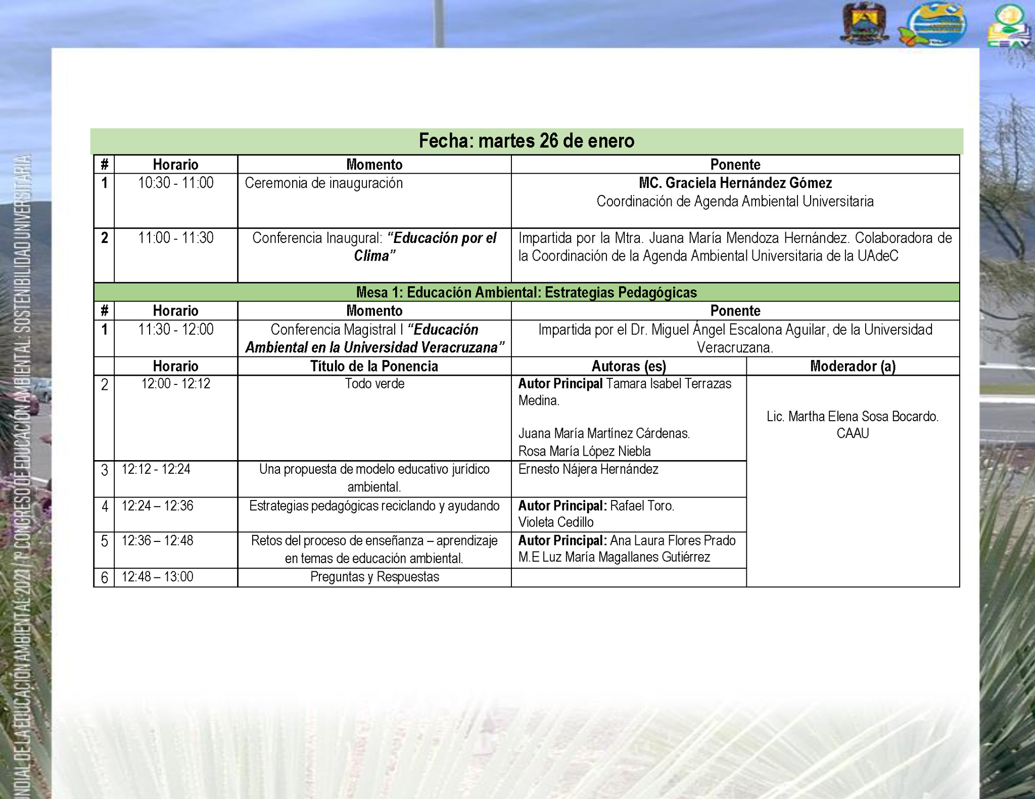 Posteriormente a las 11:30 horas inicia la mesa de trabajo 1: Educación Ambiental-Estrategias Pedagógicas, con la presentación de la conferencia magistral “Educación Ambiental en la Universidad Veracruzana”, por el Dr. Miguel Ángel Escalona Aguilar; y a las 12:00 horas, comienzan las ponencias “Todo Verde” y “Una propuesta de modelo educativo jurídico ambiental”.