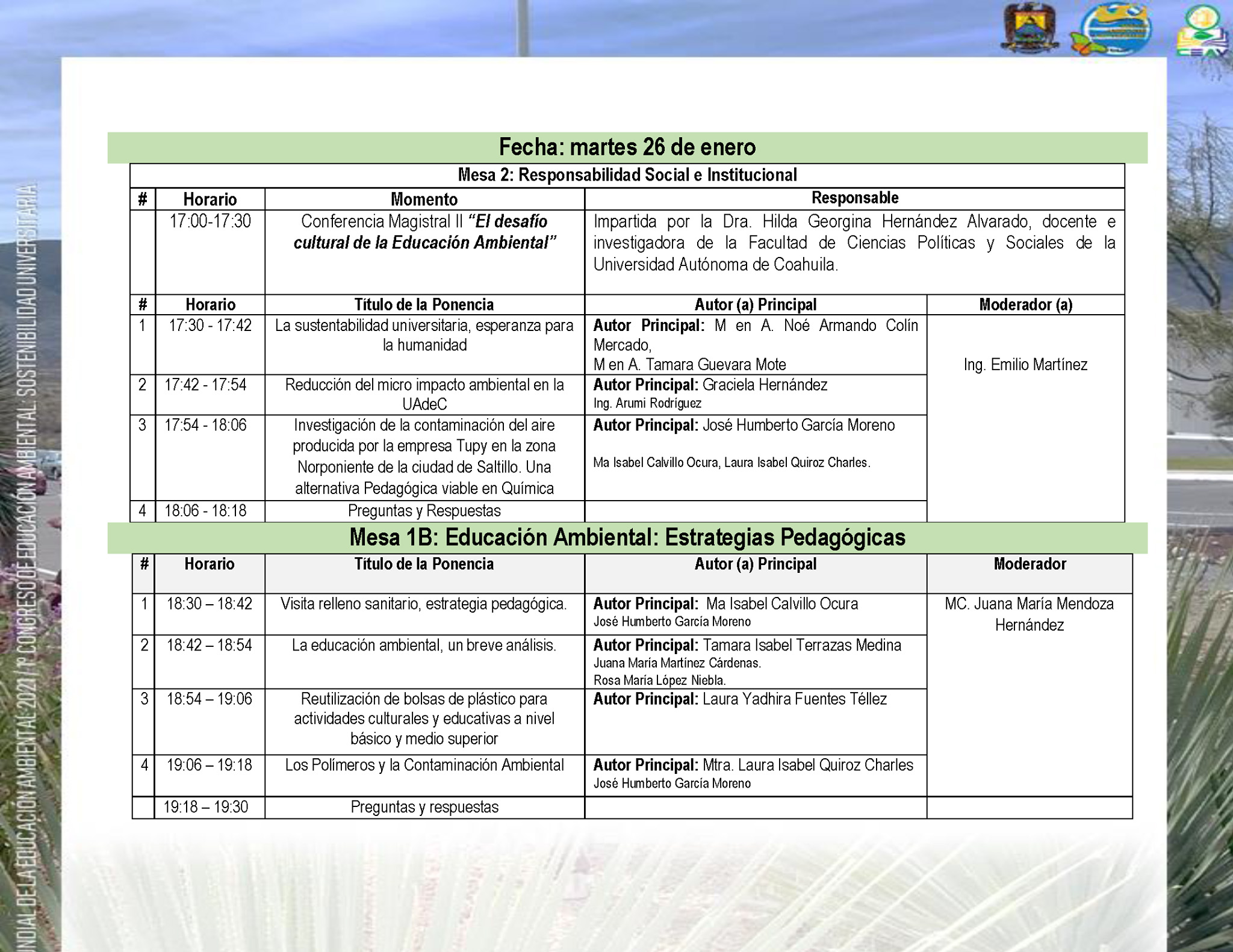 También, “Estrategias pedagógicas: reciclando y ayudando” y “Retos del proceso de enseñanza-aprendizaje en temas de educación ambiental”, modera Martha Elena Sosa Bocardo; por la tarde a las 17:00 horas, dan inicio los trabajos de la mesa de trabajo 2: Responsabilidad Social e Institucional, con la charla “El desafío cultural de la Educación Ambiental”.