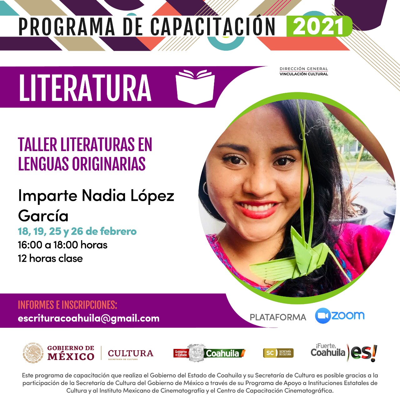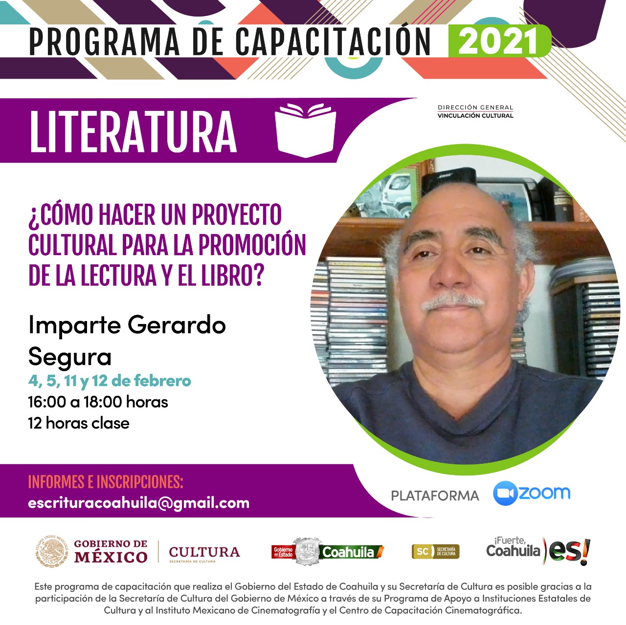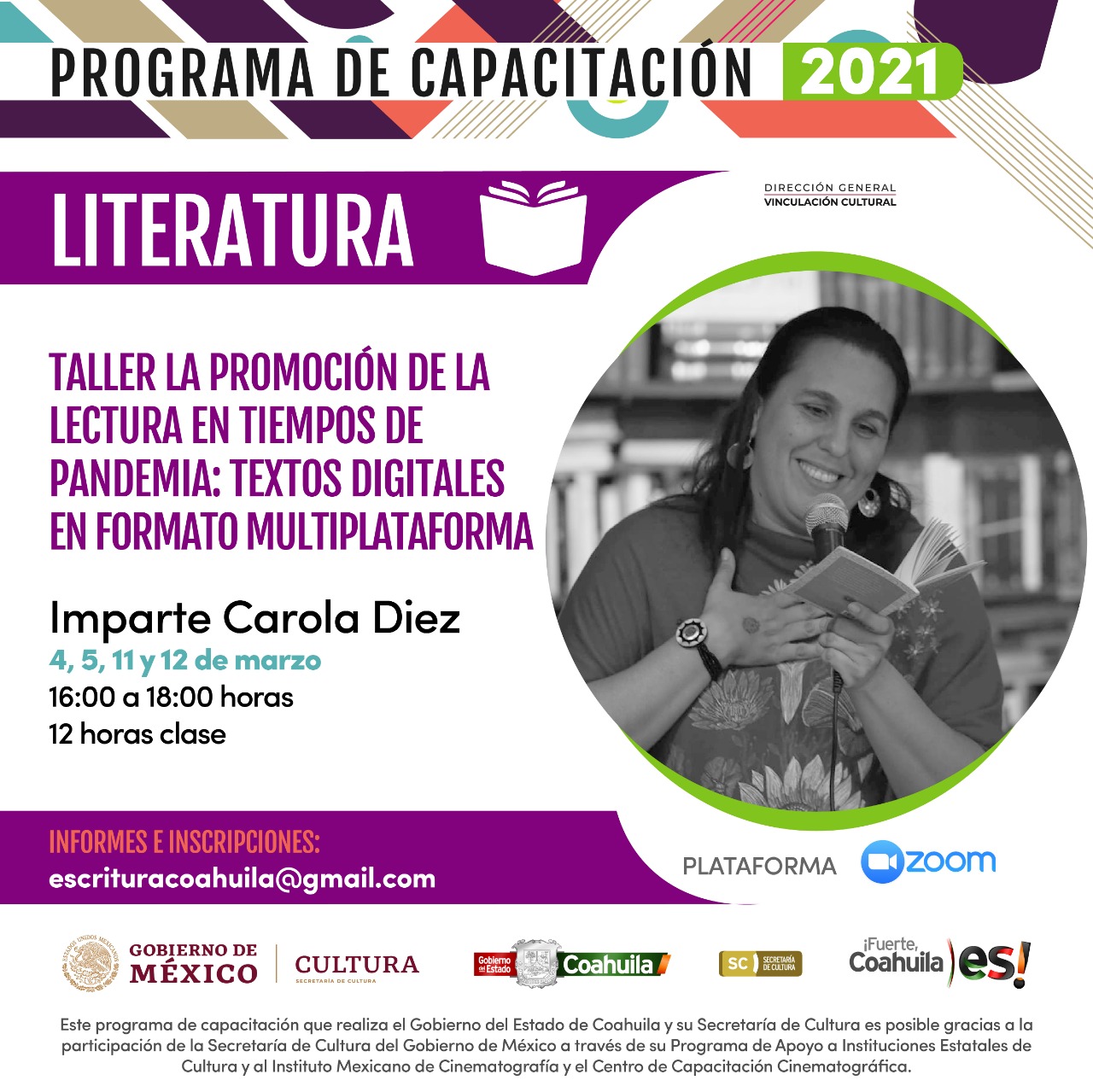 García Camil detalló que para informes sobre estos talleres de literatura, se pone a disposición de los interesados el siguiente correo electrónico: escrituracoahuila@gmail.com.