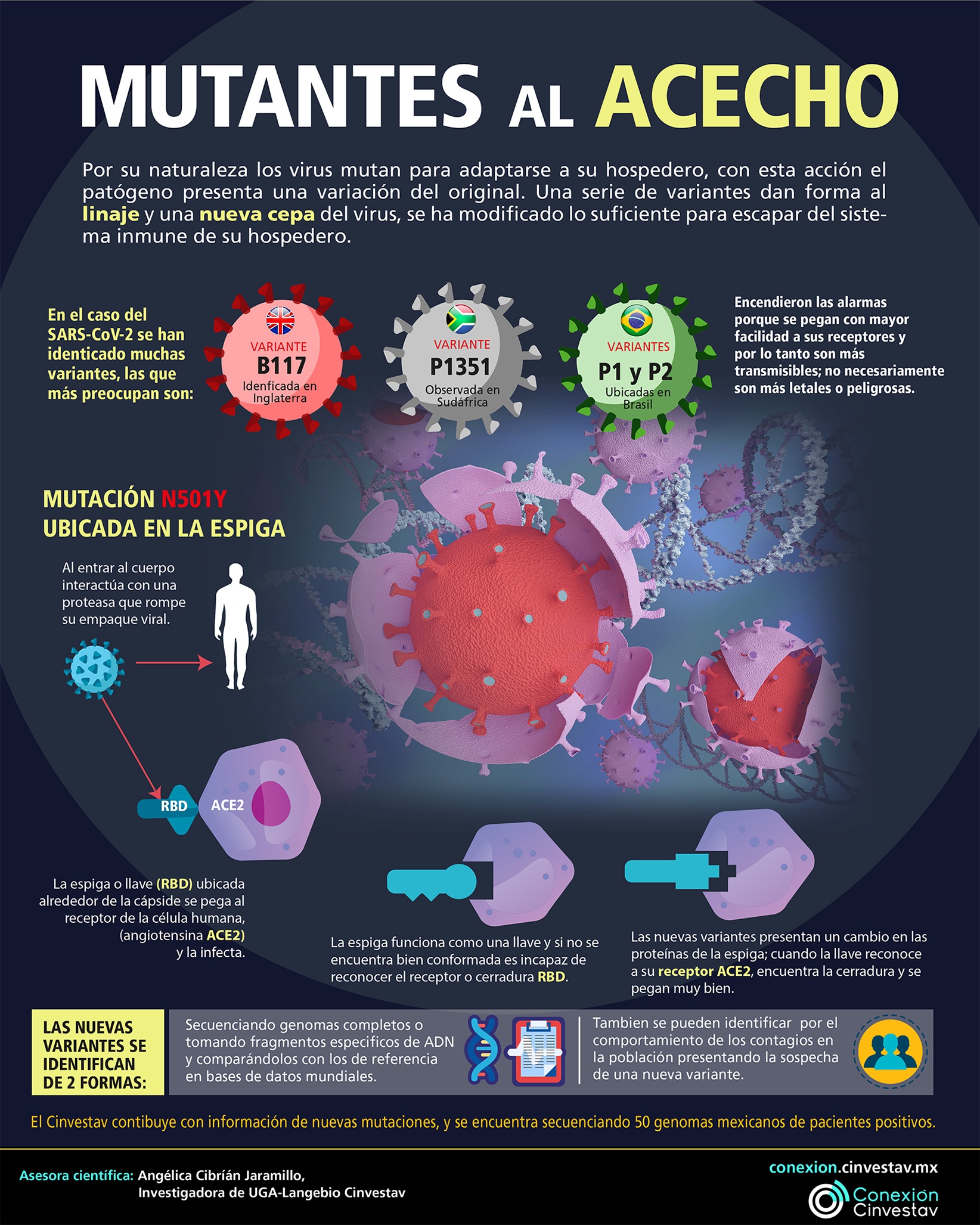 “Las variantes de SARS-CoV-2 que preocupan son la B117, identificada en Inglaterra; las P1 y P2, observada en Brasil, y la P1351 o 20C501Y.B2, descubierta en Sudáfrica, porque presentan mutaciones en la espiga o cerca de ella permitiendo al virus pegarse bien con sus receptores humanos y con ello la hacen más transmisible”, explicó Angélica Cibrián Jaramillo, investigadora de la Unidad de Genómica Avanzada (UGA) del Cinvestav.