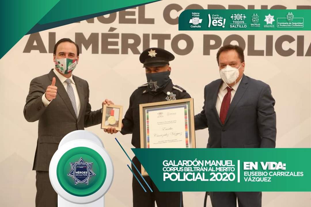 El alcalde de Saltillo, Manolo Jiménez Salinas entregó el Galardón Manuel Corpus Beltrán al Mérito Policial 2020 y destacó que, si Saltillo se consolidó entre las ciudades más seguras de México, es debido al trabajo que se realiza en la policía municipal y a la coordinación que existe con las diferentes instancias.