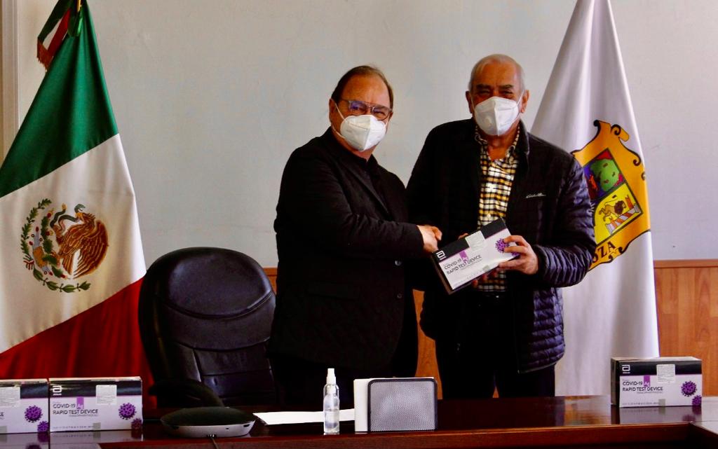 Eliud Aguirre Vázquez, Jefe de la Jurisdicción Sanitaria 8, en Saltillo, fue el encargado de recibir de manos de Bernal Gómez las pruebas que se enviarán de manera inmediata a los distintos centros médicos de la región, que serán aplicadas a personas con sospecha de portar el virus SARS-CoV-2, para contener y evitar el riesgo de algún brote en estos lugares.