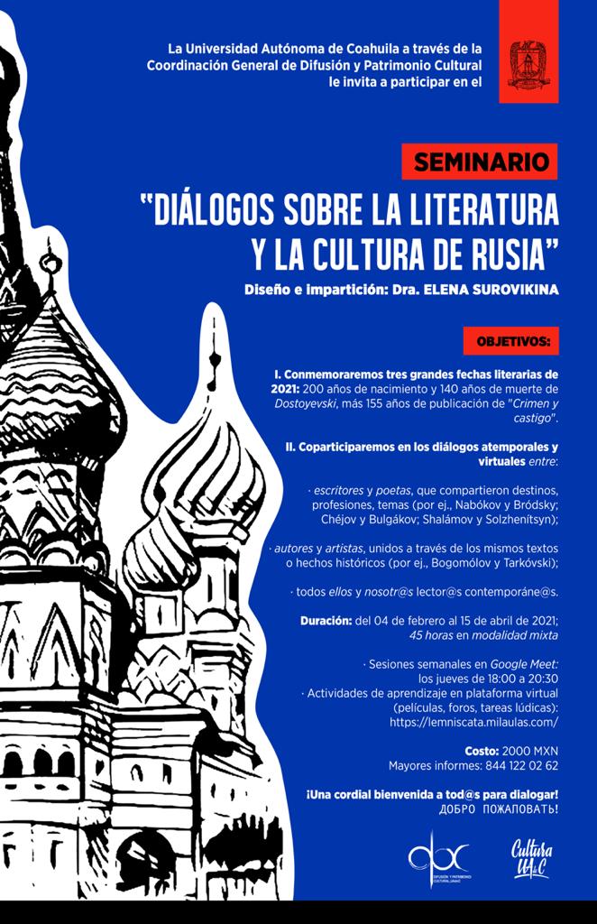 La Coordinación General de Difusión y Patrimonio Cultural de la Universidad Autónoma de Coahuila trae para el público del 4 de febrero al 15 de abril el Seminario “Diálogos sobre la literatura y la cultura de Rusia” impartido por la doctora Elena Surovikina.