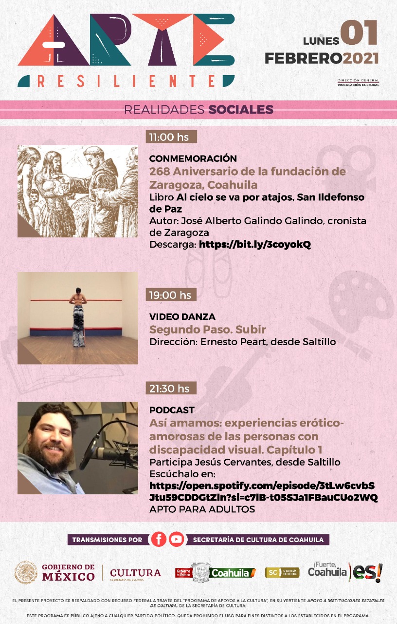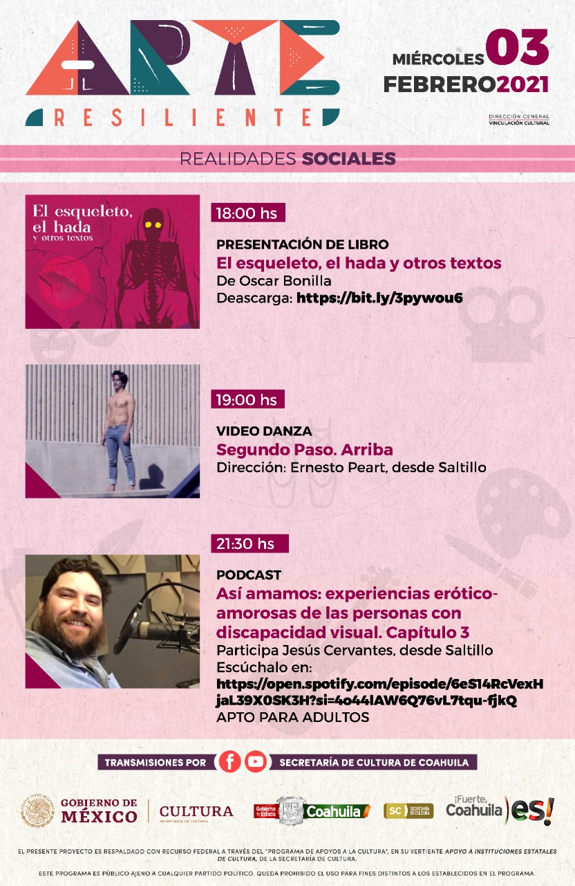 Para el día miércoles se contempla la presentación de libro ‘El esqueleto, el hada y otros textos’, de Óscar Bonilla, a las 18:00 horas vía Facebook. Su descarga se encuentra disponible en: https://coahuilacultura.gob.mx/wp-content/uploads/2021/01/3-FEB-EL-ESQUELETO-EL-HADA-Y-OTROS-TEXTOS.pdf. A las 19:00 horas se transmite el video ‘Danza Segundo Paso. Arriba’, bajo la dirección de Ernesto Peart.