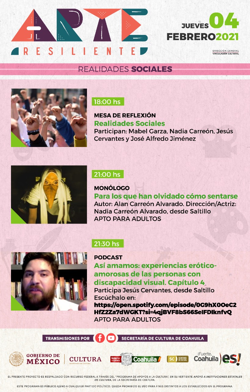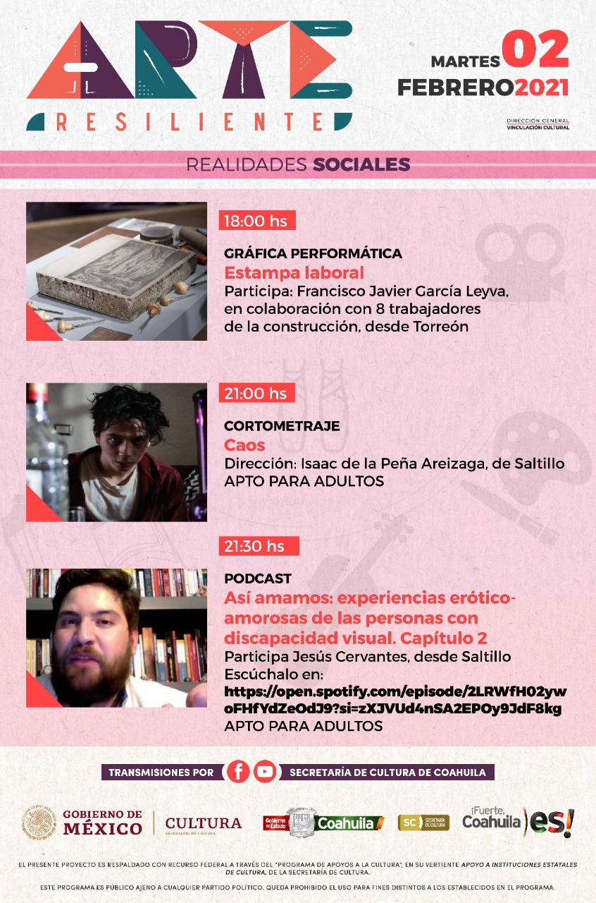“Estamos dando inicio a las actividades de Arte Resiliente. El día de mañana a las 18:00 horas se transmite ‘Gráfica performática, Estampa laboral’, y a las 21:00 horas el cortometraje ‘Caos’, ambos vía Facebook y YouTube”, dijo.
