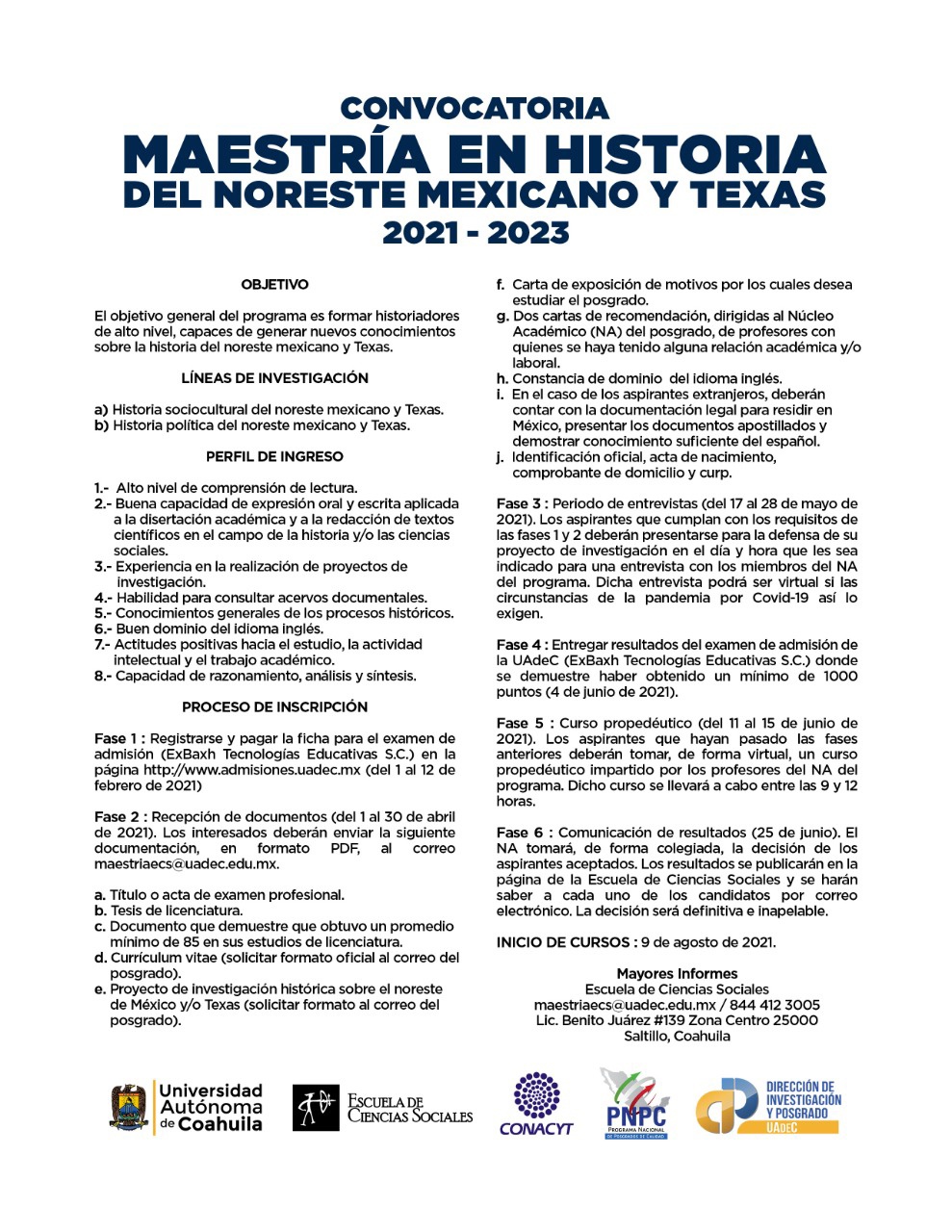 Con el fin de formar investigadores especializados en el Noreste de México y Texas, la Escuela de Ciencias Sociales de la Universidad Autónoma de Coahuila convoca a estudiar la maestría en Historia del Noreste Mexicano y Texas para el periodo 2021-2023.