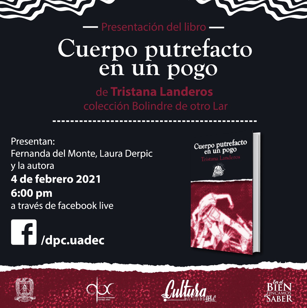 El libro fue presentado por la Maestra en Dramaturgia, Fernanda del Monte y la Magister en Creación Teatral, Laura Derpic; “Cuerpo putrefacto en un pogo” es la más reciente obra de la dramaturga potosina Tristana Landeros y es publicada por la UA de C, formando parte de la colección “Bolindre de otro Lar”.