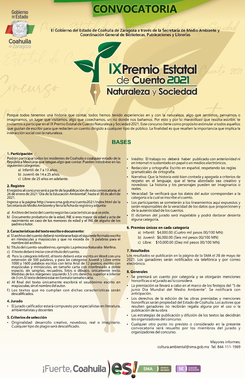 El Gobierno del Estado de Coahuila, a través de la Secretaría de Medio Ambiente y la Coordinación General de Bibliotecas, Publicaciones y Librerías, invita a participar en el IX Premio Estatal de Cuento 2021 “Naturaleza y Sociedad”.