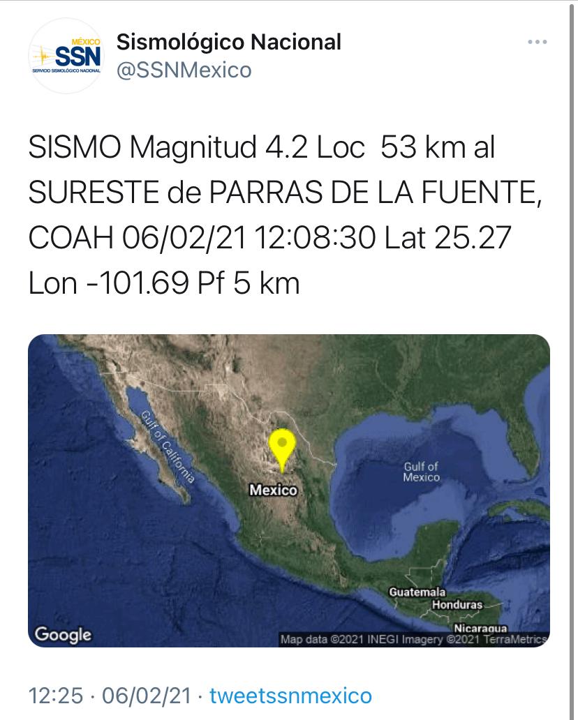 El Servicio Sismológico Nacional reportó este sábado un sismo de magnitud 4.2 en el ejido Macuyú, de General Cepeda, a una profundidad de 5 km.