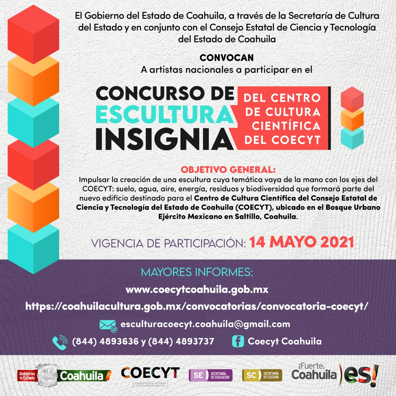 Un millón de pesos obtendrá el artista plástico que resulte ganador del “Concurso de Escultura Insignia del Centro de Cultura Científica, COECYT”, convocatoria realizada por el Consejo Estatal de Ciencia y Tecnología del Estado de Coahuila (COECYT) en coordinación con la Secretaría de Cultura.