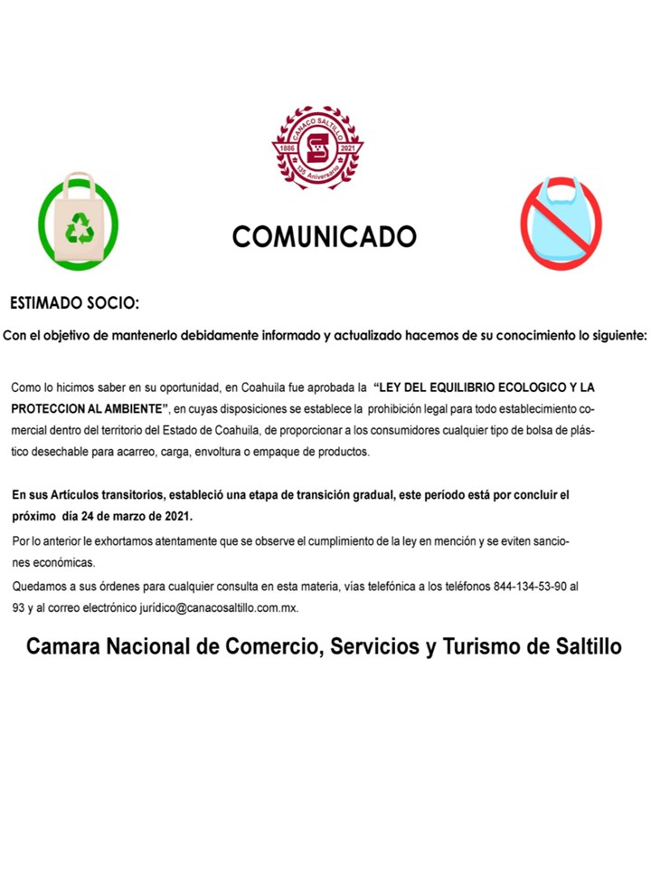 La Cámara de Comercio de Saltillo (CANACO) solicitó a los comerciantes de esta capital dejar de utilizar en sus establecimientos cualquier tipo de bolsa de plástico desechable para acarreo, carga, envoltura o empaque de productos, esto ante la conclusión el próximo 24 de marzo de la etapa de transición gradual para la implementación de la Ley de Equilibrio Ecológico y Protección al Ambiente.