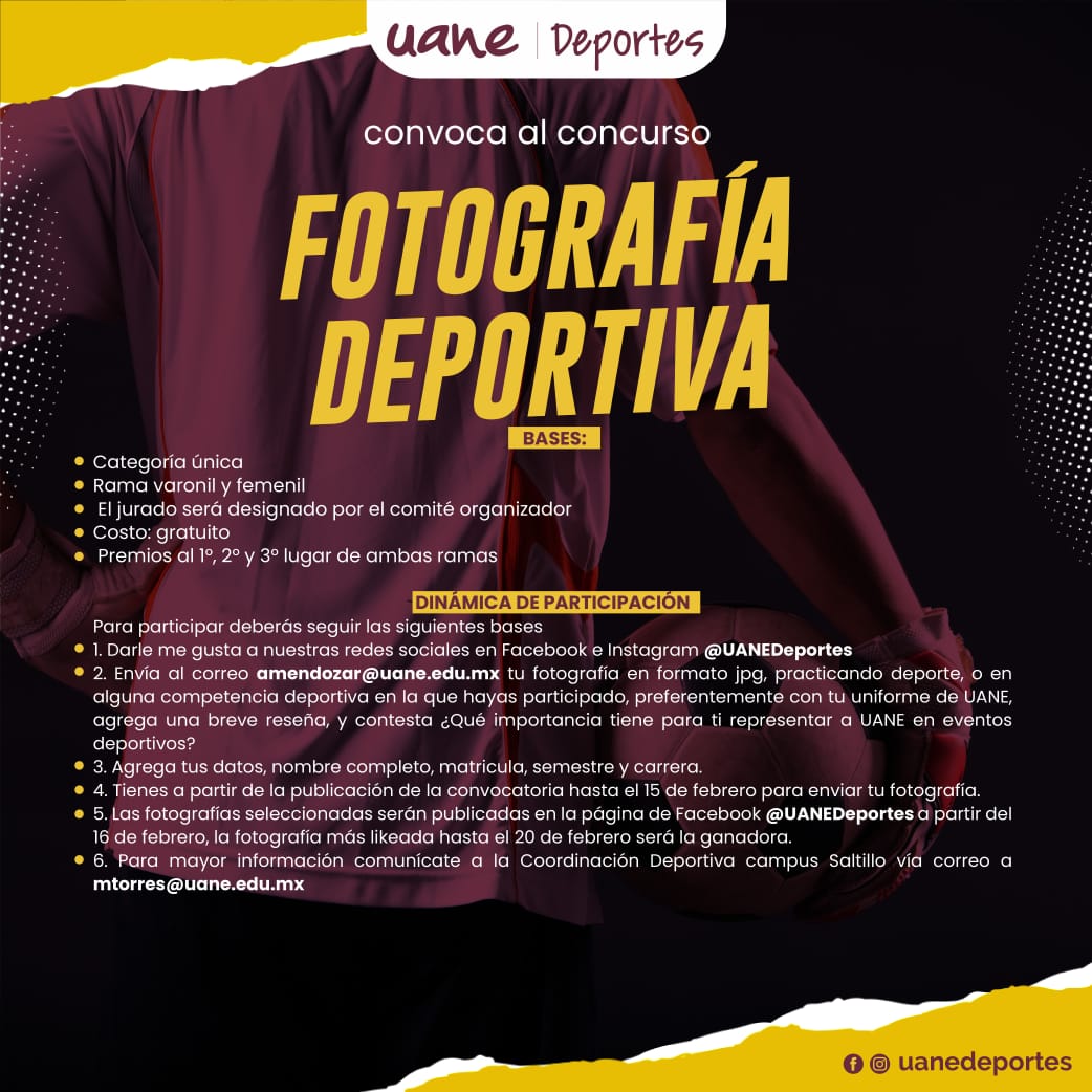 A este envío se deberá agregar una breve reseña de la fotografía concursante, la respuesta a la pregunta ¿Qué importancia tiene para ti representar a UANE en eventos deportivos? y datos como nombre completo, matrícula, semestre y carrera.