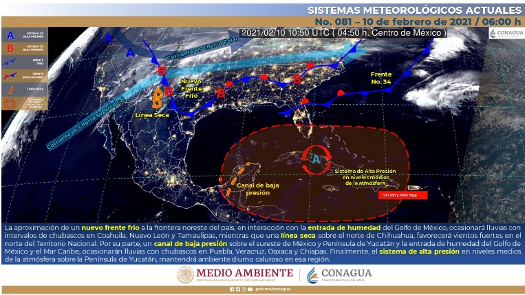 La aproximación de un nuevo frente frío a la frontera noreste del país, en interacción con la entrada de humedad del Golfo de México, ocasionará lluvias con intervalos de chubascos en Coahuila, mientras que una línea seca sobre el norte de Chihuahua favorecerá vientos fuertes en el norte del territorio nacional.
