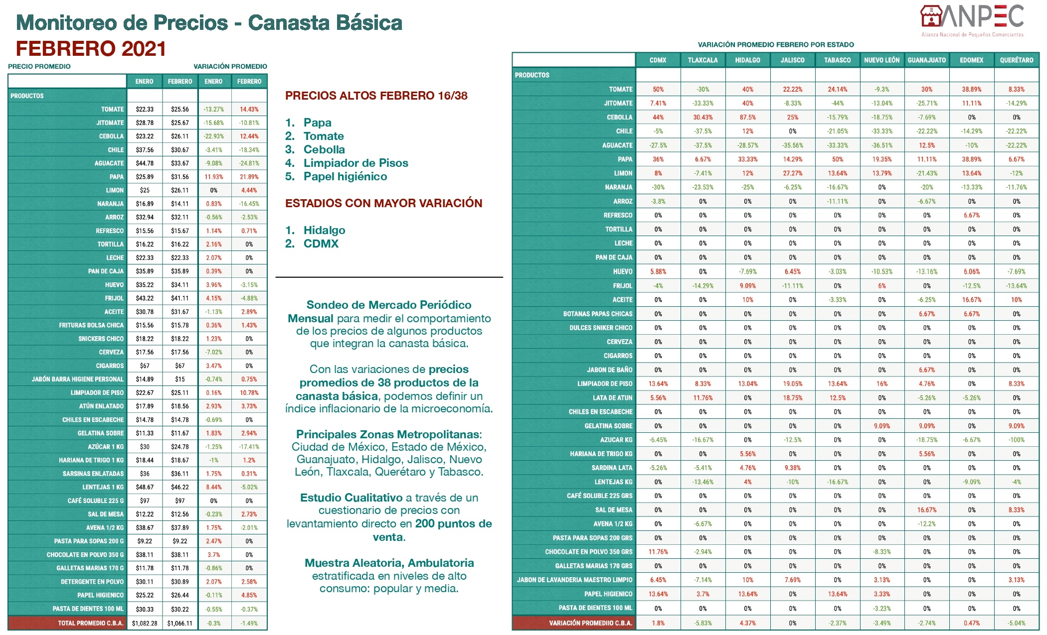 Ciudad de México.- La Alianza Nacional de Pequeños Comerciantes (ANPEC), como cada mes, realizó su sondeo de mercado del 15 de enero al 15 de febrero en el que se monitorea la variación de precios de los alimentos esenciales de la canasta básica en CDMX, Tlaxcala, Edo. de México, Hidalgo, Guanajuato, Querétaro, Jalisco, Nuevo León y Tabasco. Estos fueron los hallazgos de incrementos en los precios de los productos: