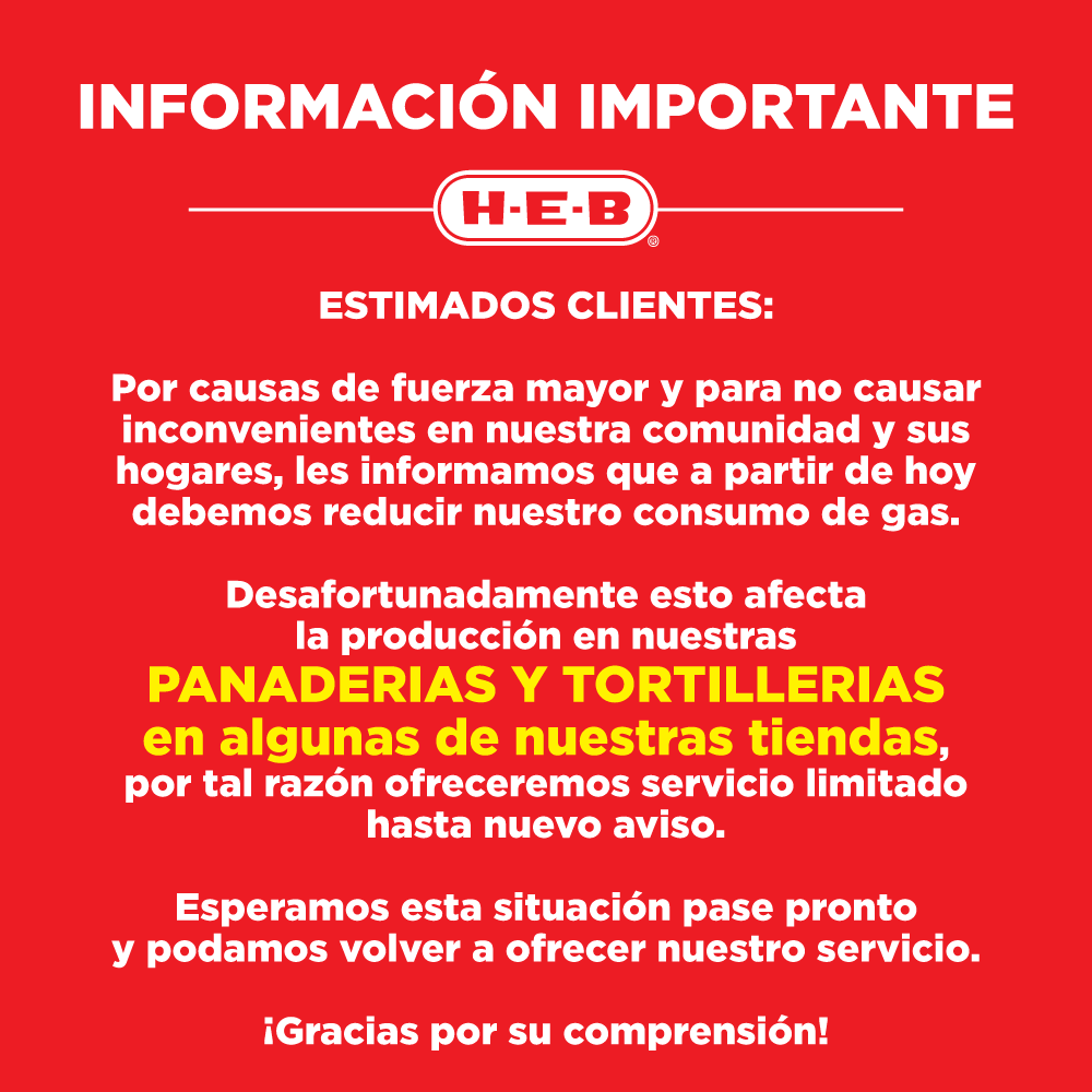 La cadena comercial HEB anunció que a partir de este miércoles comenzará a reducir su consumo de gas, lo que afectará la producción en panaderías y tortillerías en algunas de sus tiendas.