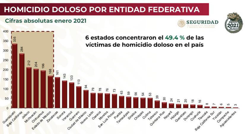 En las cifras absolutas de homicidios dolosos por entidad federativa en enero de 2021, Coahuila aparece como el sexto estado con menor incidencia, reportando 16 homicidios en el primer mes del año, contrastando con los estados que presentaron los índices más altos: Guanajuato con 335, Baja California con 284, Jalisco con 212, Michoacán con 204, Chihuahua con 196, Estado de México con 168 y Zacatecas con 161.