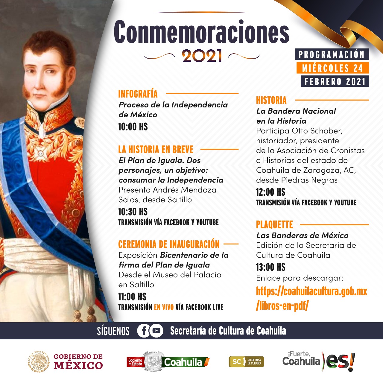 La Secretaría de Cultura coahuilense (SC) dio a conocer que en el marco de las Conmemoraciones 2021, con diversas actividades cívicas se recordará este 24 de febrero el aniversario del Plan de Iguala y el Día de la Bandera, símbolo patrio e identitario de nuestro país.