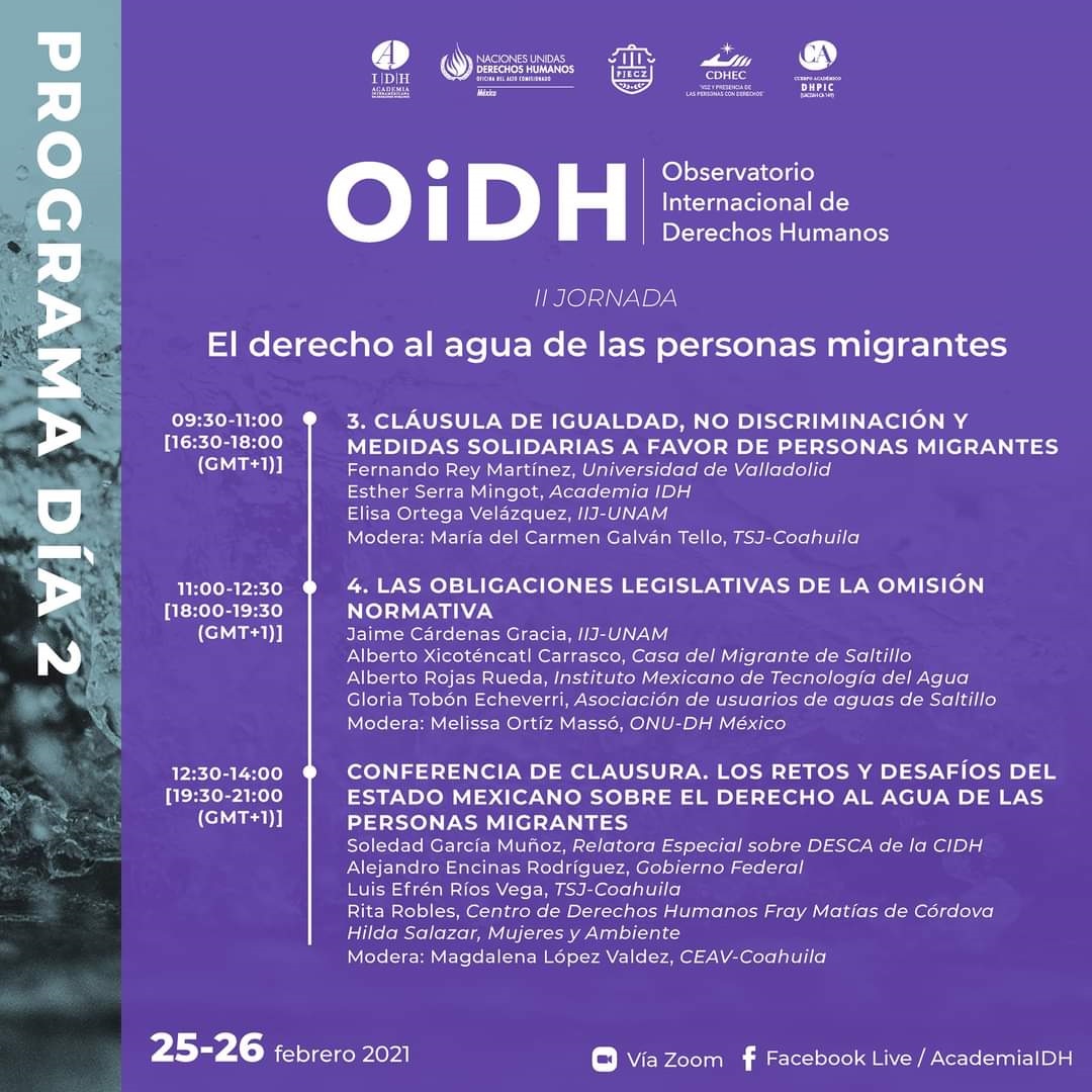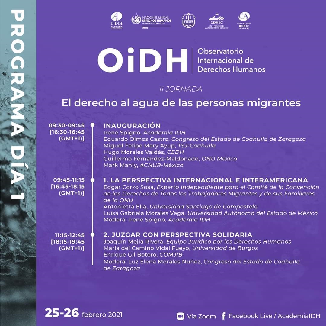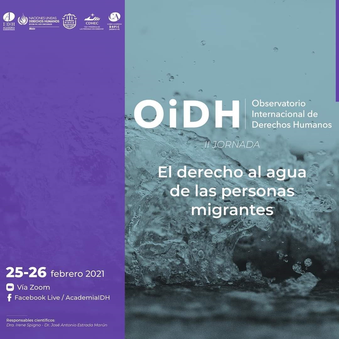 La Academia Interamericana de Derechos Humanos de la Universidad Autónoma de Coahuila, invita a participar en la II Jornada del Observatorio Internacional de Derechos Humanos “El Derecho al Agua de las Personas Migrantes”, a efectuarse los días 25 y 26 de febrero a través de Zoom y de Facebook Live en la página AcademiaIDH.