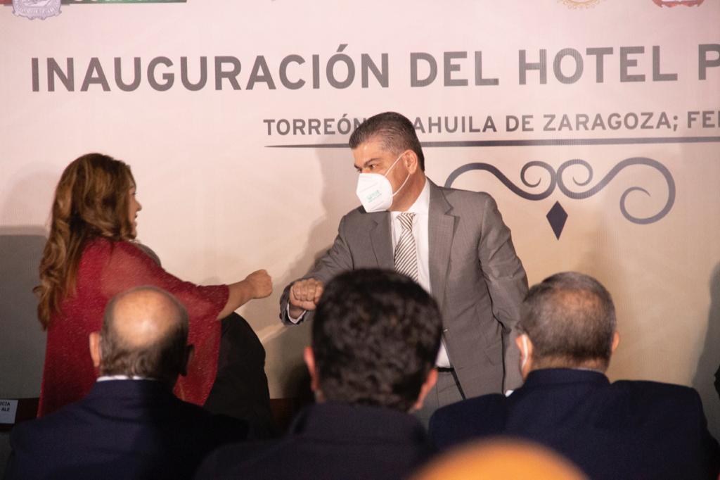 “Reconocemos la defensa ante la Federación del presupuesto que le corresponde a Coahuila, la forma en que se ha enfrentado la situación de la pandemia. Al gobernador Miguel Riquelme y al alcalde Jorge Zermeño, por el impulso para la construcción de este hotel, pero también para la familia Herrera”, señaló.