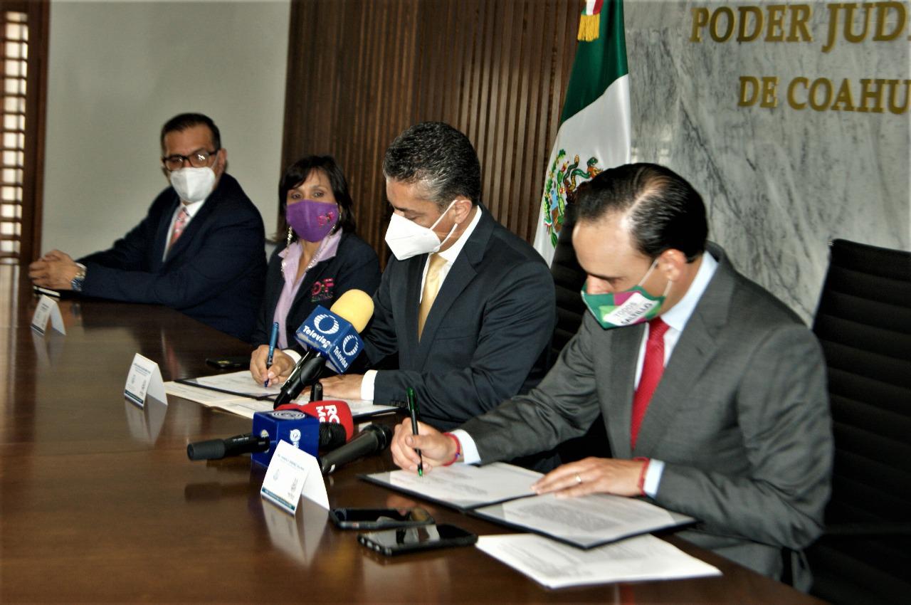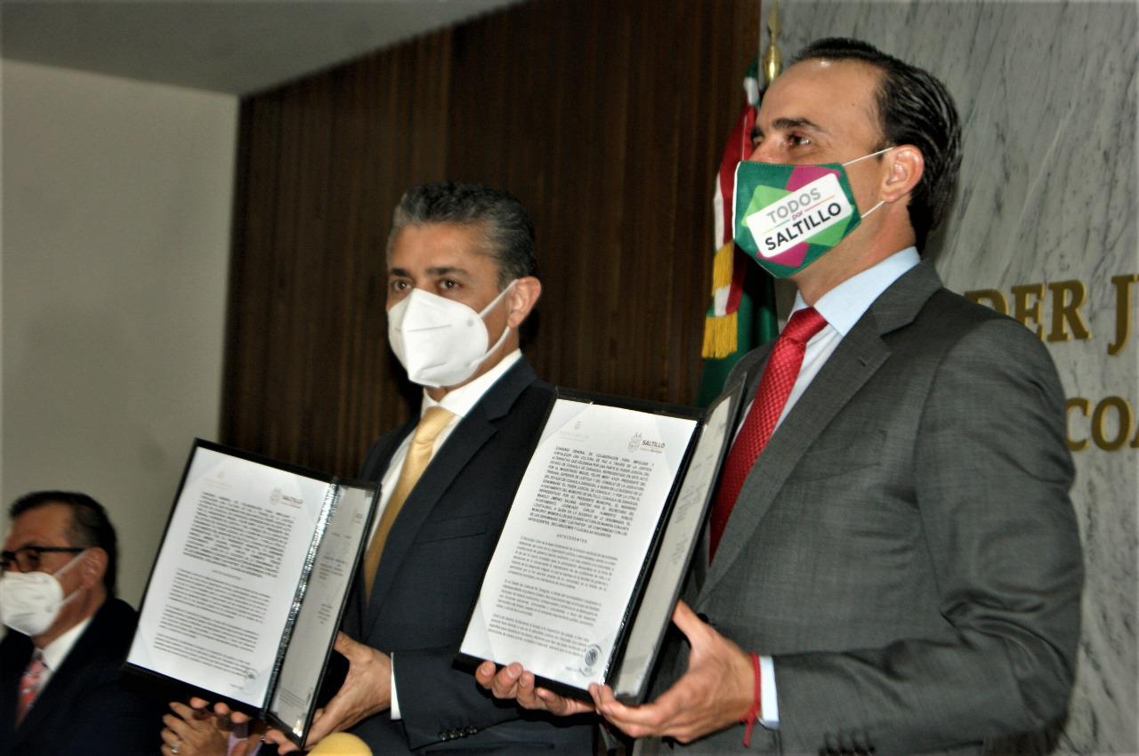Para impulsar y fortalecer una cultura de paz a través de la justicia alternativa entre el Poder Judicial del Estado de Coahuila y el Municipio de Saltillo, en la Sala de Juntas de Presidencia del Palacio de Justicia se firmó el convenio de colaboración por parte del Magistrado Miguel Felipe Mery Ayup, Presidente del Tribunal Superior de Justicia y el Ing. Manolo Jiménez Salinas, Presidente Municipal de Saltillo.