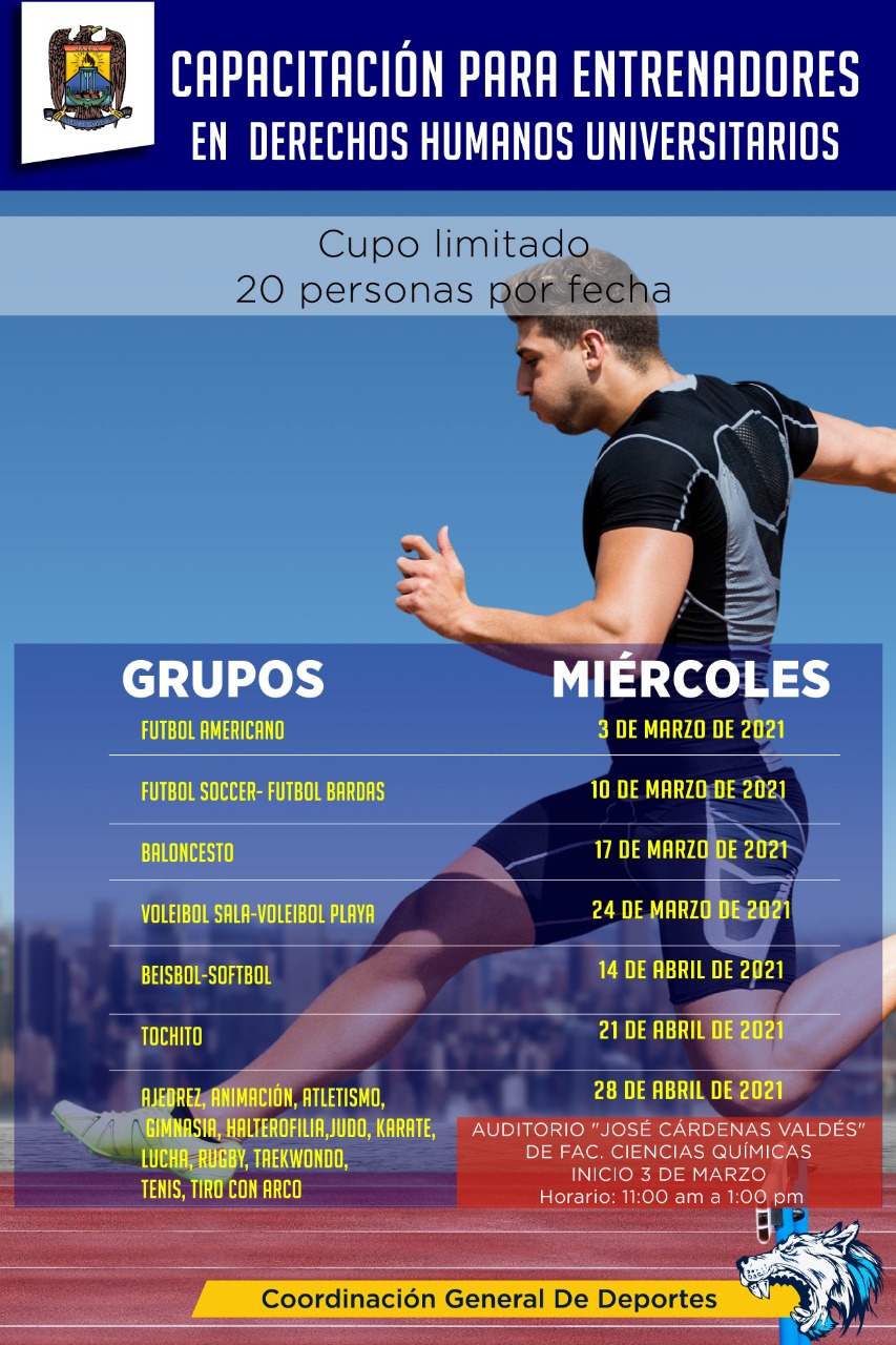 En este esquema, David Hernández Barrera, coordinador general del Deporte en la UA de C, refirió que esta dinámica se realizará a partir del próximo 3 de marzo, de 11:00 de la mañana a 1:00 de la tarde, en el Auditorio «José Cárdenas Valdés» de la Facultad de Ciencias Químicas, siendo necesario registrarse previamente en la página de Facebook «Lobos UAdeC», donde también se pueden obtener mayores informes.