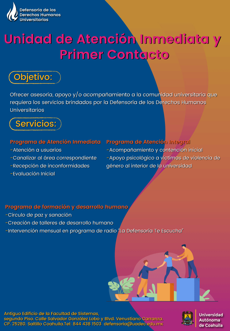 Con el objetivo de ofrecer a la comunidad universitaria asesoría, apoyo y acompañamiento de manera más eficaz, la Defensoría de los Derechos Humanos Universitarios pone a disposición su nueva “Unidad de Atención Inmediata y de Primer Contacto”.