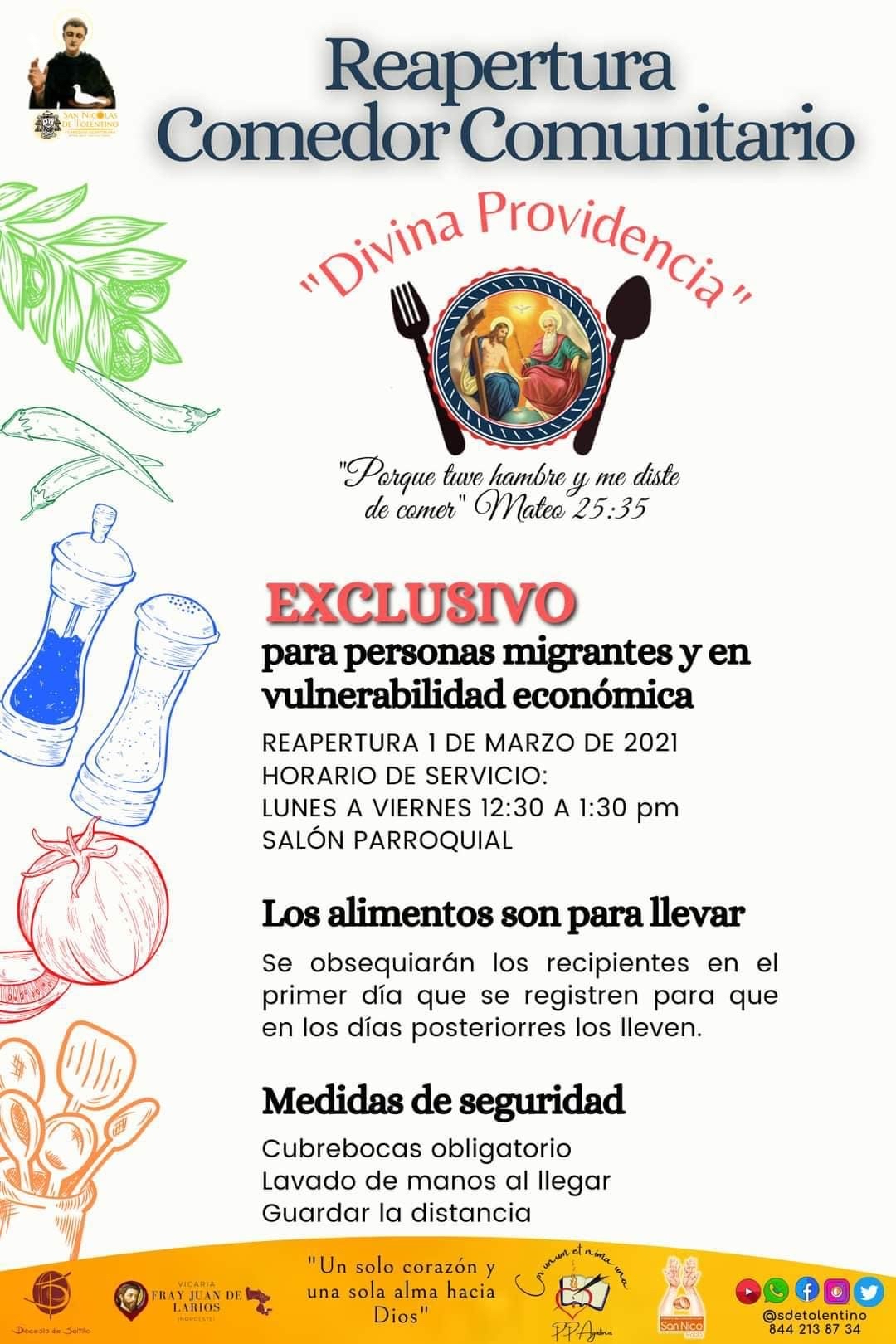 La parroquia de San Nicolás de Tolentino en Ramos Arizpe reabrirá a partir del primero de marzo su actividad altruista en beneficio de migrantes y personas con vulnerabilidad en el comedor comunitario Divina Providencia. Los alimentos se entregarán para llevar de lunes a viernes en un horario de 12:30 a 13:30 pm, así lo informó el párroco Roberto Velázquez Tetazin.