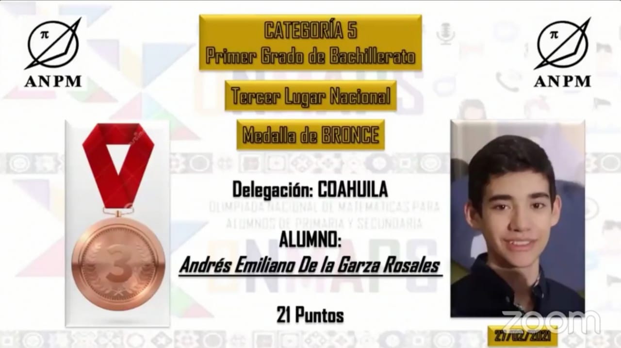 Este fin de semana fueron publicados los resultados finales de la XX Olimpiada Nacional de Matemáticas, realizada el pasado 29 y 30 de enero por la Organización Nacional de Profesores de Matemáticas (ANPM), evento en el que el joven saltillense Andrés Emiliano de la Garza Rosales obtuvo medalla en la categoría 5 representando al Estado de Coahuila.