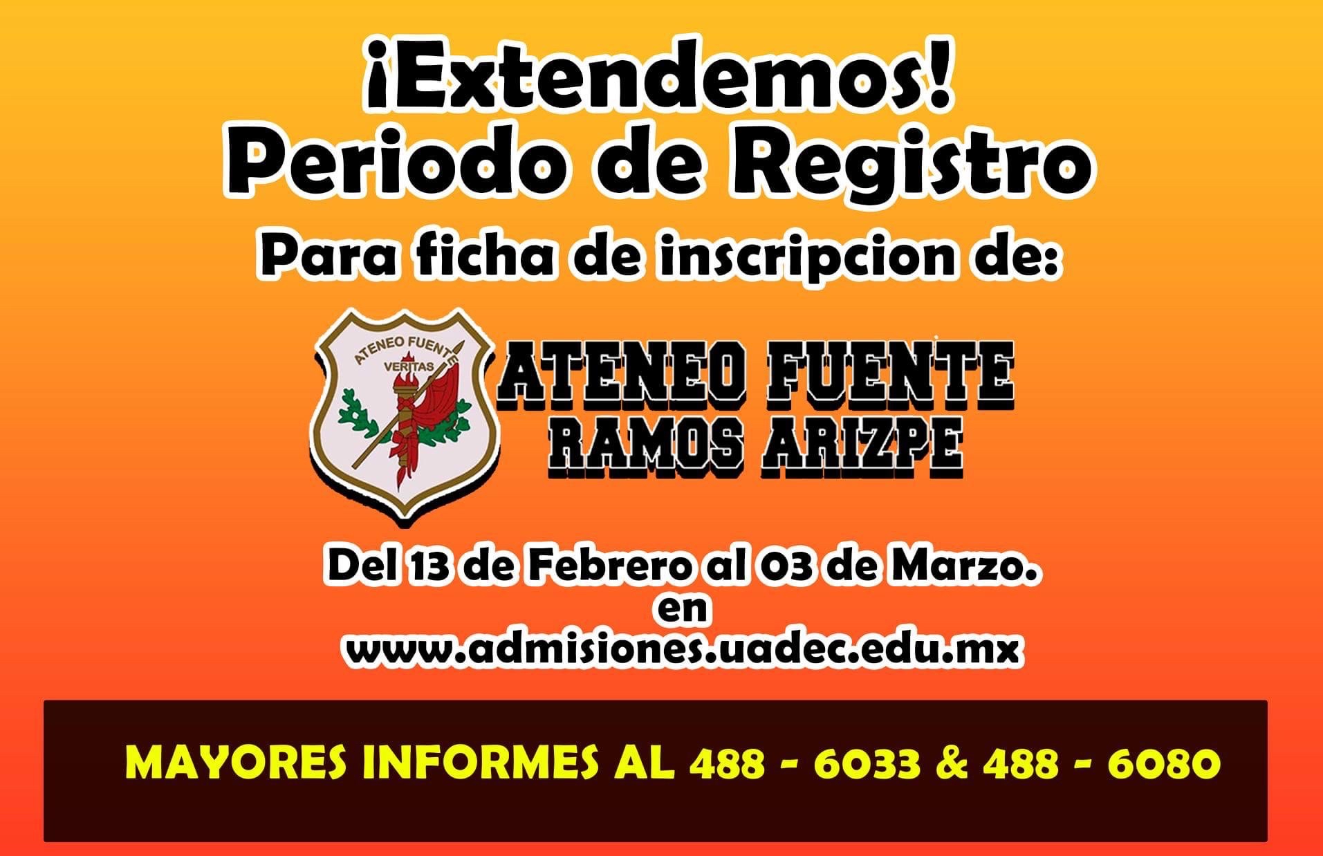 “El registro lo ampliamos un poco más, a partir del 13 de febrero al 3 de marzo es la última fecha de registro, se amplió 15 días más para que los jóvenes de nivel secundaria que estén interesados en ingresar al bachillerato del Ateneo Fuente, extensión Ramos Arizpe puedan inscribirse, el próximo miércoles finalizamos el registro” agregó el directivo.